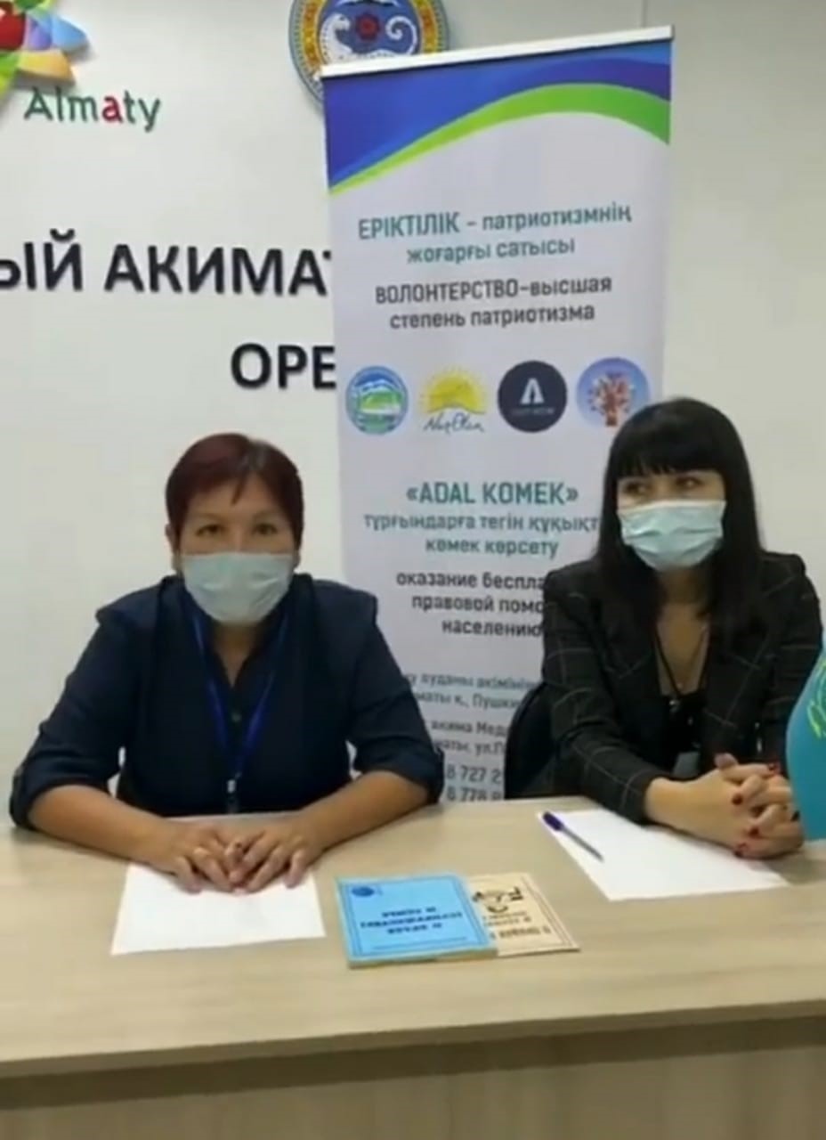 На базе Общественного Фонда «Социальный дом «Rahym» (ул.Шокая, д.23/13) совместно с аппаратом акима Медеуского района и с участием представителей Департамента юстиции города Алматы, нотариуса, частных судебных исполнителей, медиаторов в рамках реализации проекта «Adal Komek» проведена бесплатная юридическая консультация граждан по правовым вопросам.