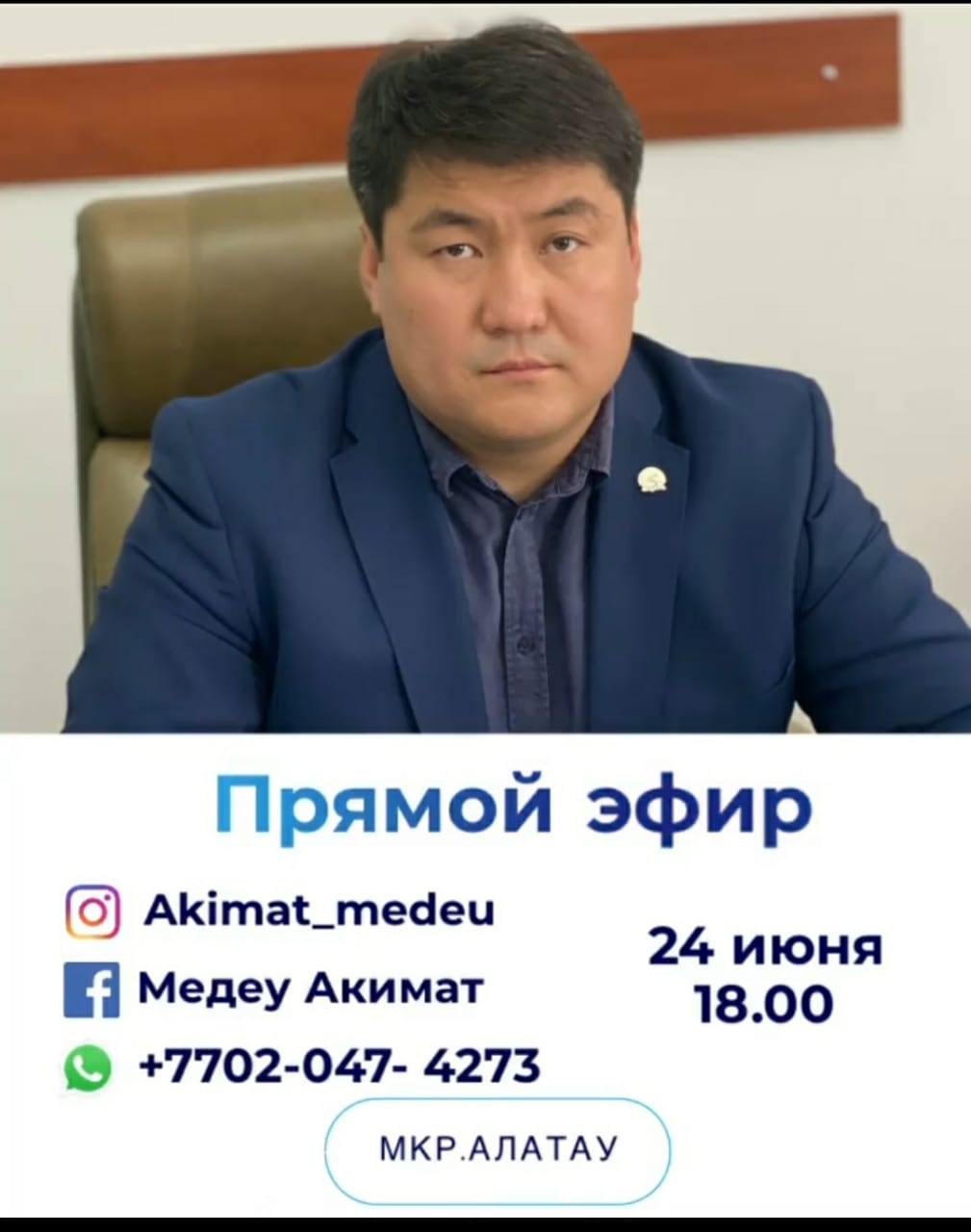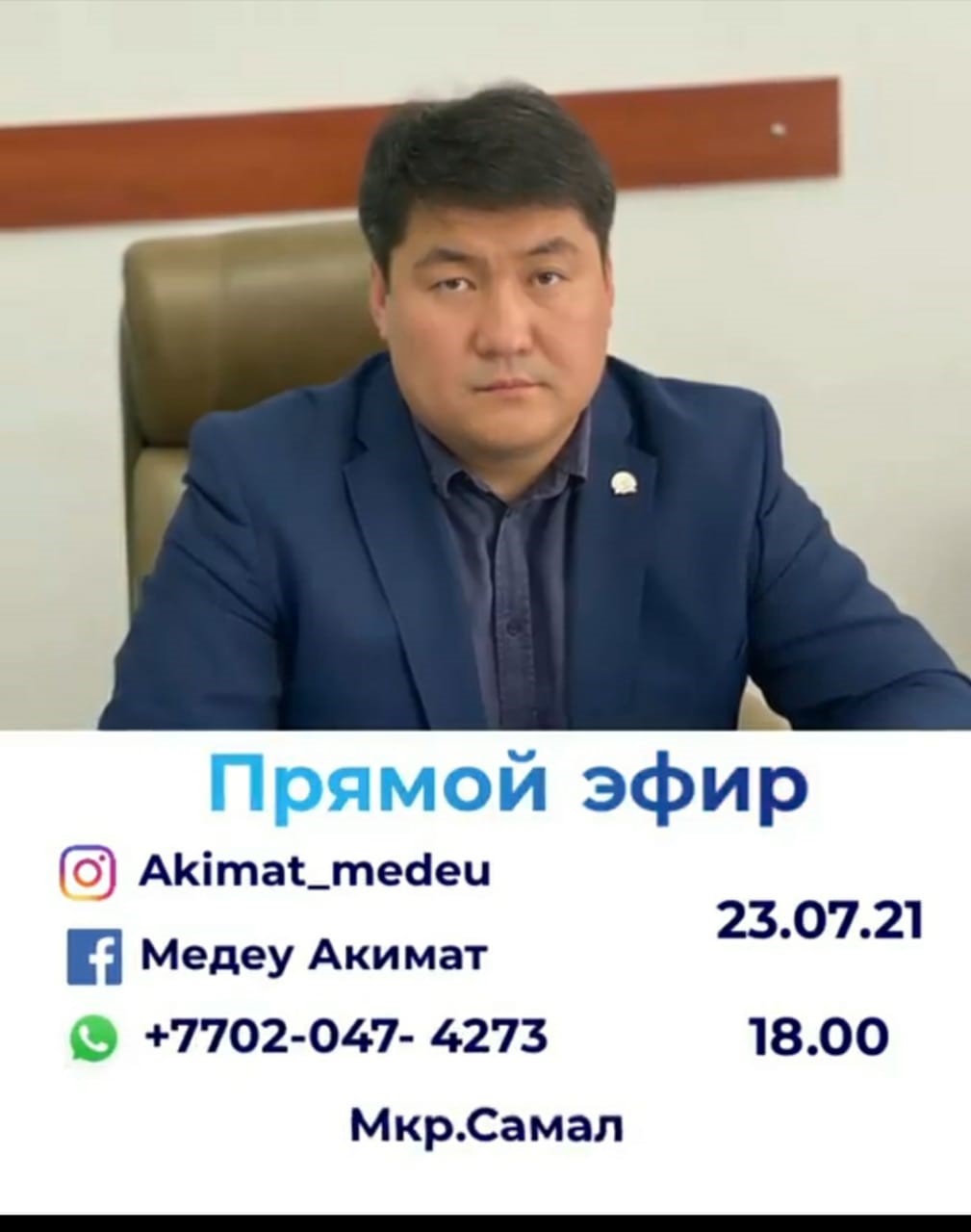 Акимом района Асет Масабаев проведен прямой эфир онлайн встреча с жителями мкр. Музтау и Каменское плато через социальные сети Instagram и Facebook. В ходе прямого эфира жители получили разъяснения и ответы на свои поставленные вопросы.