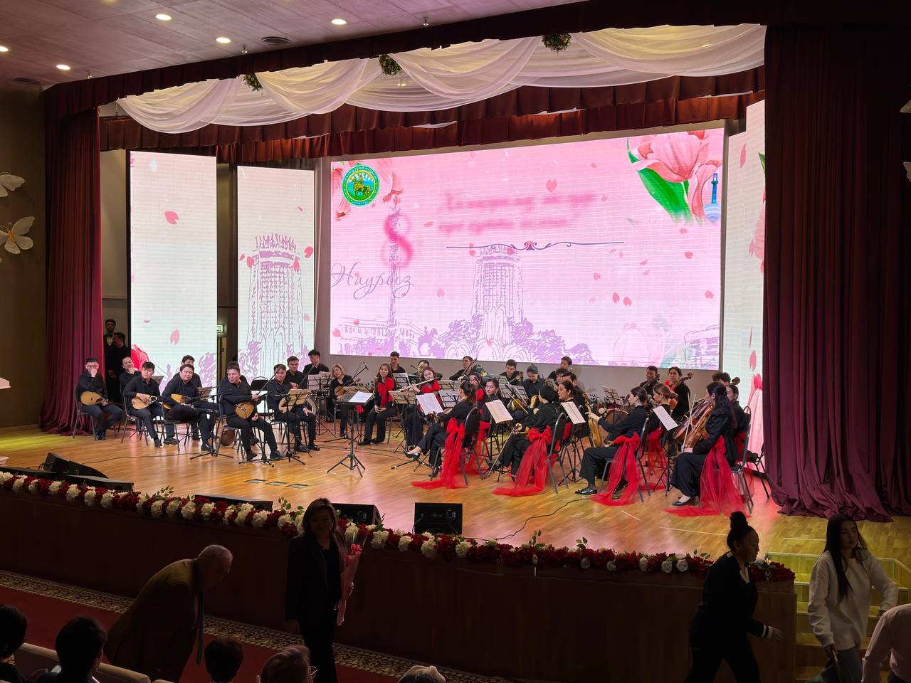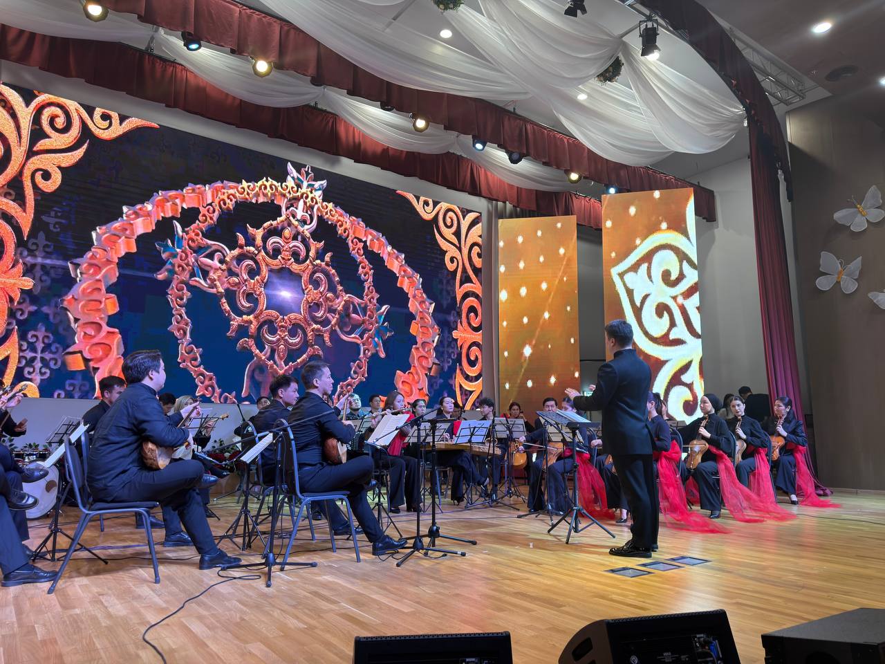 В рамках праздничного вечера перед зрителями выступил Государственный академический фольклорно-этнографический оркестр «Отырар сазы» имени Нургисы Тлендиева. Коллектив под руководством главного дирижёра и художественного руководителя, заслуженного деятеля Республики Казахстан, кавалера орденов «Құрмет» и «Парасат» Динзухры Тлендиевой подарил зрителям яркую программу из национальной музыки и любимых произведений.