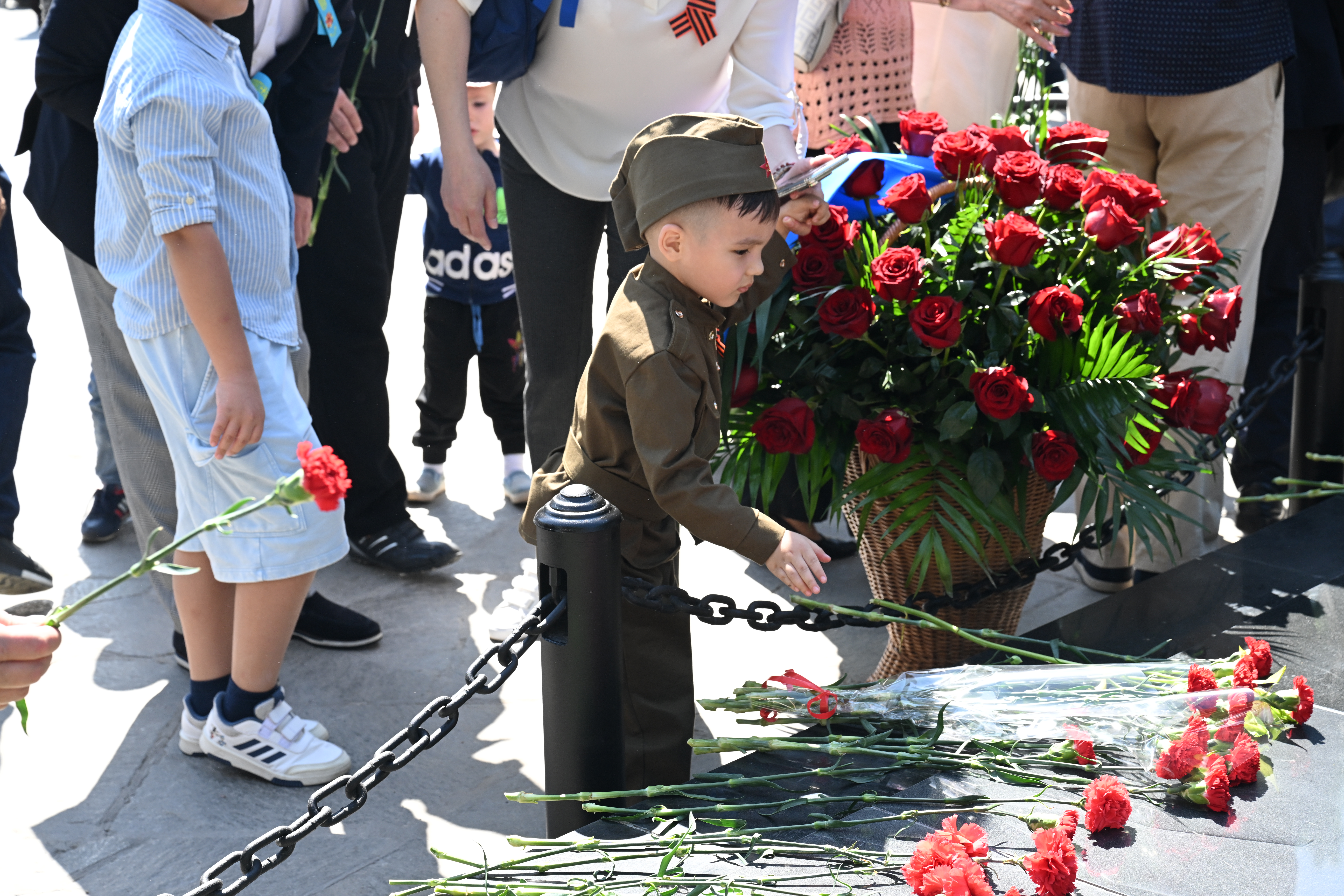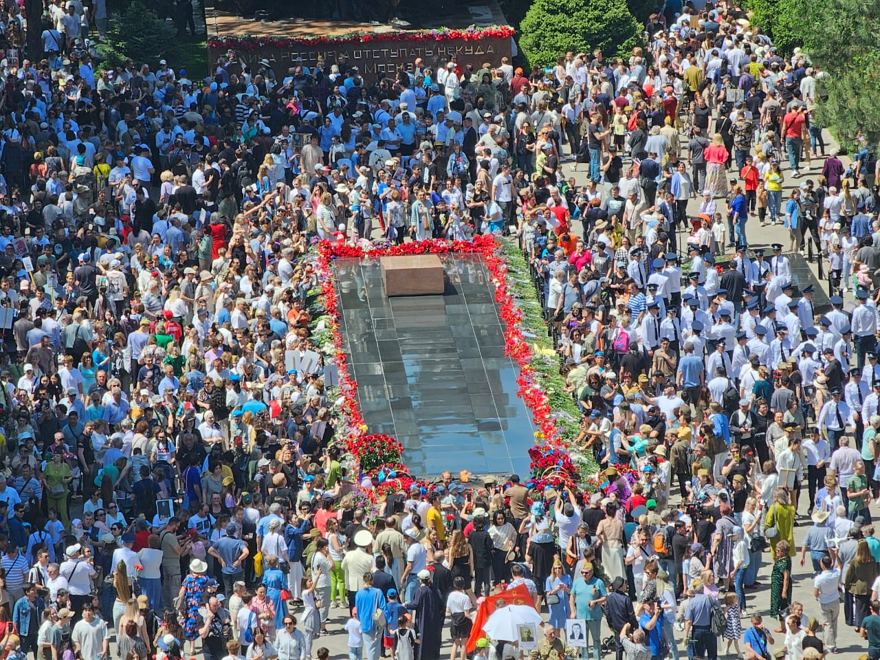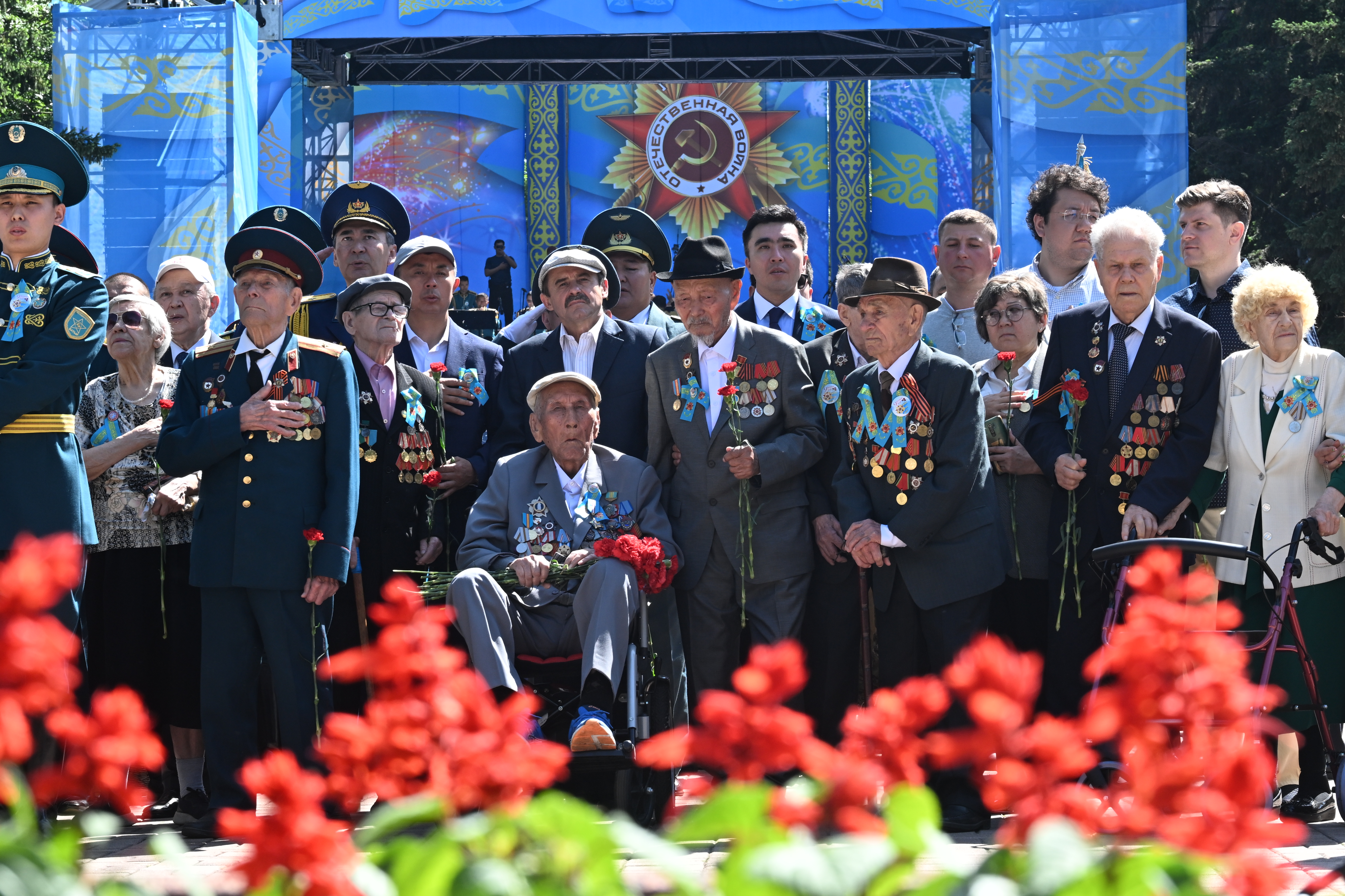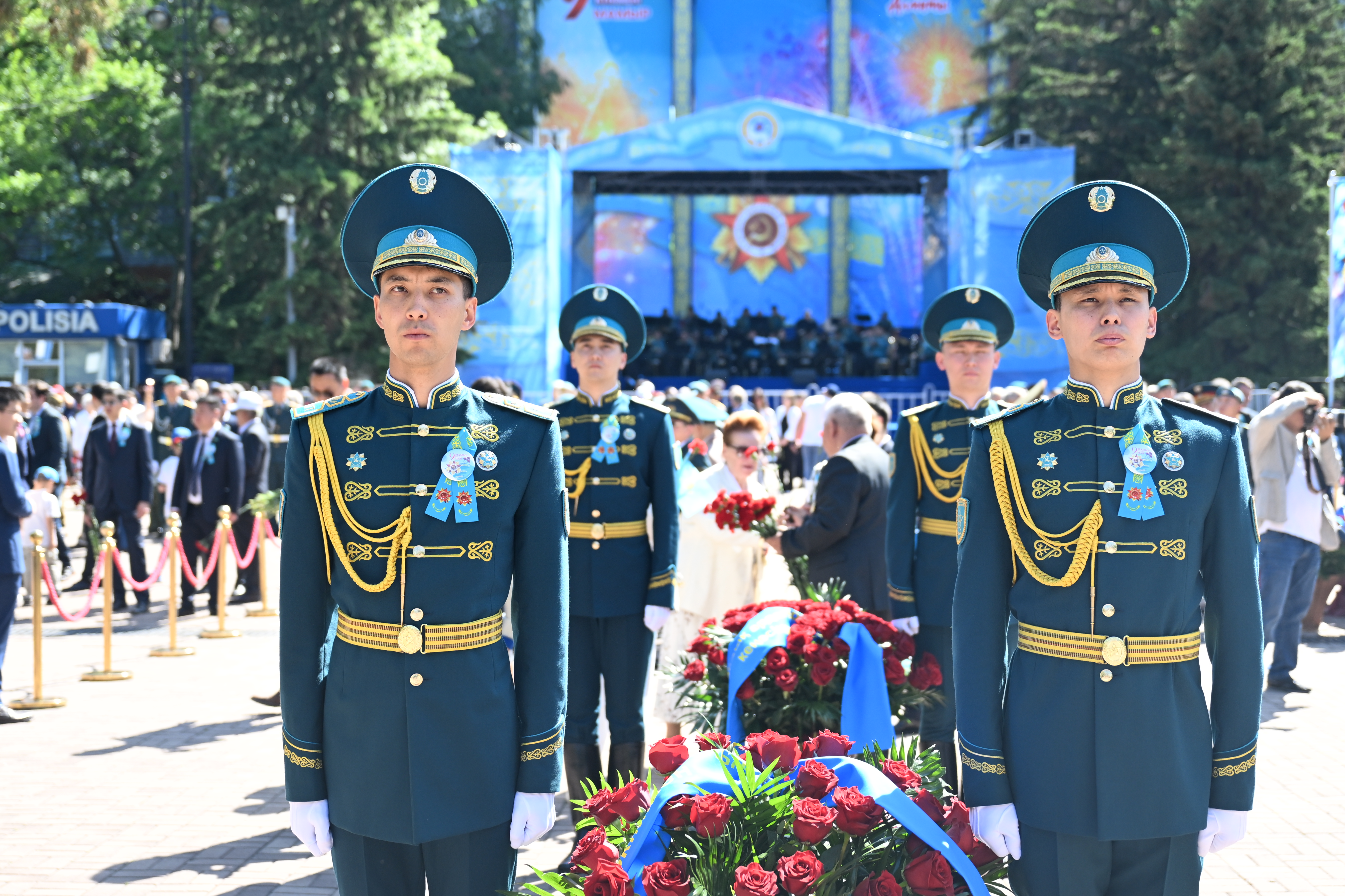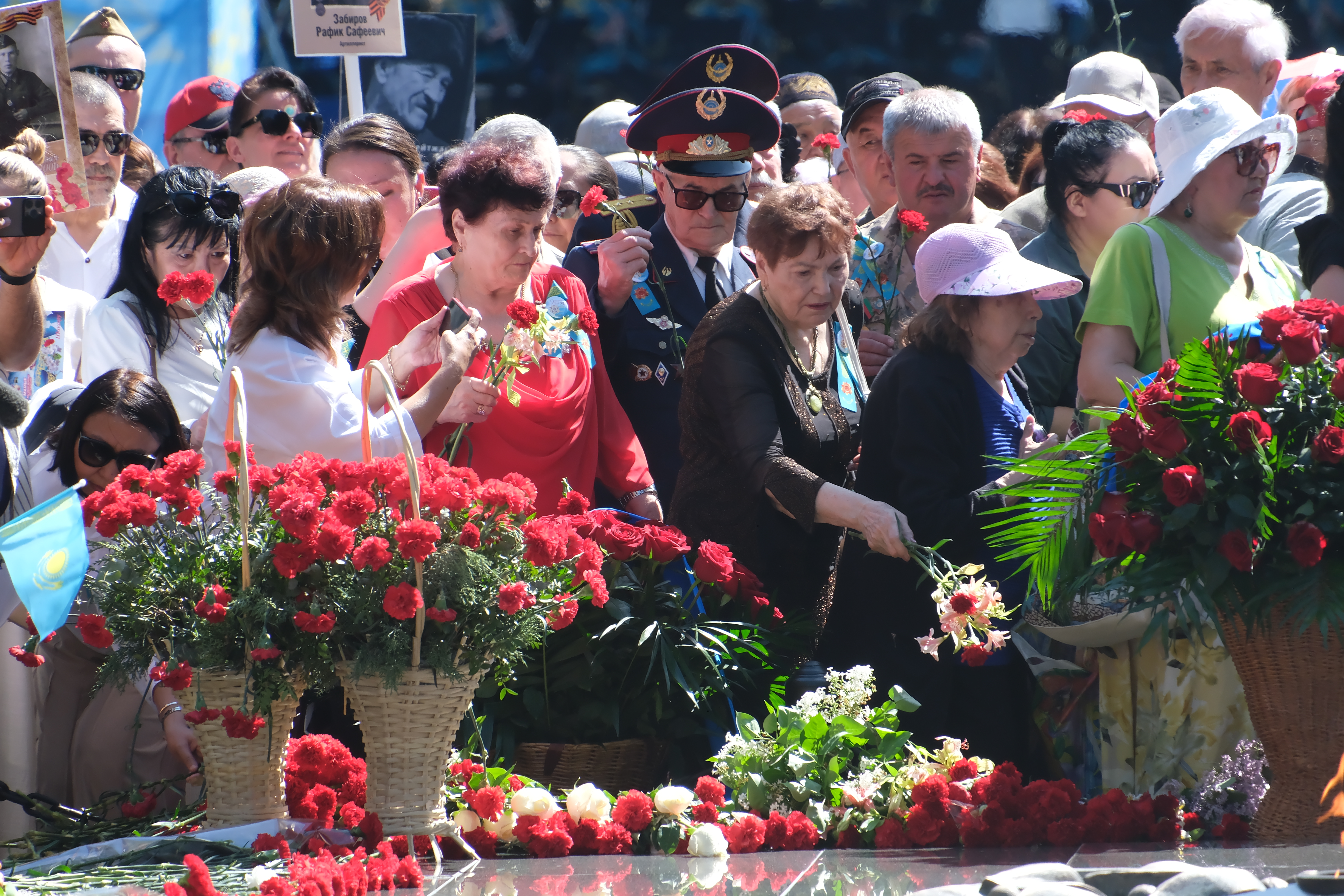 Бір минут үнсіздіктен кейін Ұлы Отан соғысының ардагерлері, тыл еңбеккерлері, әскери қызметшілер, құқық қорғау органдарының өкілдері, қоғам қайраткерлері мен қала тұрғындары қаза тапқан қазақстандық жауынгерлерді еске алуға арналған Даңқ мемориалына гүл шоқтарын қойды.