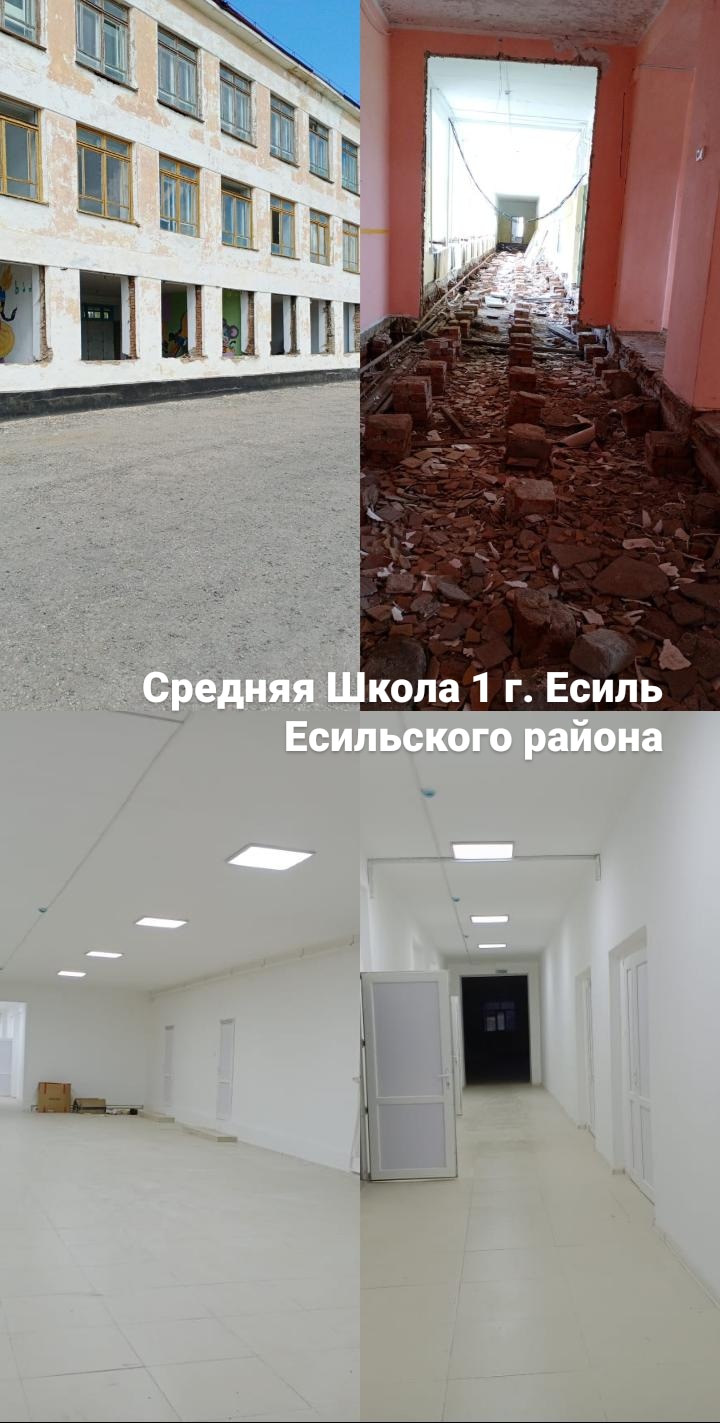 -Капитальный ремонт здания средней школы №1 г.Есиль. Общий план трудоустройства 69 человек, через Центр занятости – 35 человек, направлено на трудоустройство через Центр занятости – 39 человек: 6 человек направлены для трудоустройства в ТОО «Жалдама 2030», проект капитальный ремонт кровли, проект завершен, 42 человека направлены в ТОО «Казбалык Астана» (подрядная организация ТОО «Байлык»), их специализация неквалифицированный строительный рабочий. Проект завершен.