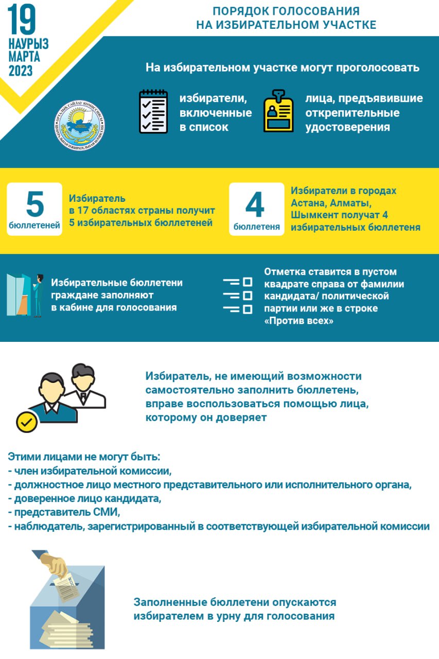 Он также обратил внимание наблюдателей от политических партий, аккредитованных общественных объединений, некоммерческих организаций Казахстана и доверенных лиц кандидатов на норму, обязывающую иметь при себе документы, удостоверяющие личность и полномочия, а для иностранных наблюдателей - документы, удостоверяющие личность и аккредитацию. Им запрещено вмешиваться в избирательный процесс, в процедуру подсчета голосов, принятия решений избирательной комиссией. Важно соблюдать правила поведения на избирательном участке.