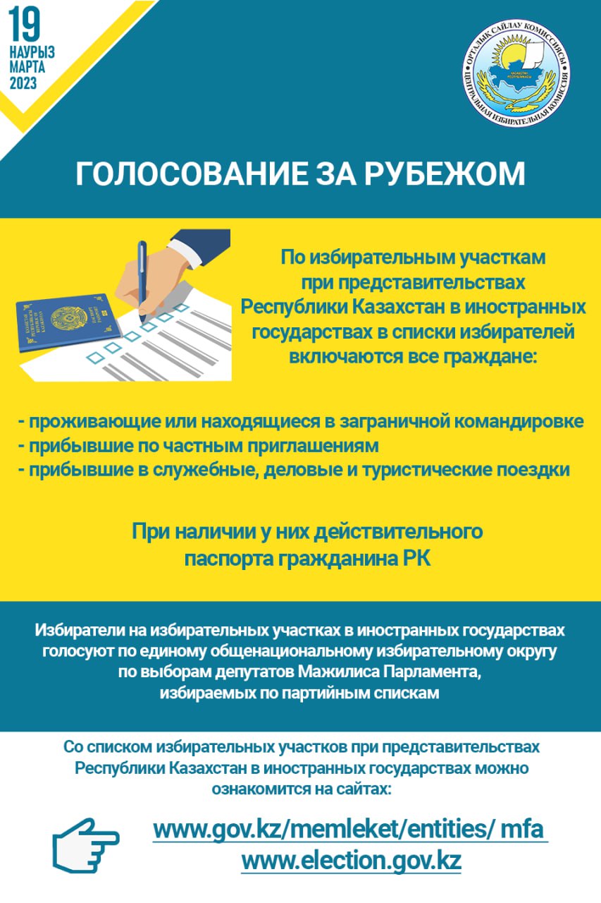 Кроме этого, заместитель Председателя ЦИК дал разъяснения по особенностям голосования за рубежом. Загранучреждения Республики Казахстан представляют всю территорию Казахстана, как часть единого общенационального избирательного округа. Поэтому голосование на 77 избирательных участках, образованных при загранучреждениях РК в 62 иностранных государствах, будет проводиться только по партийным спискам кандидатов в депутаты Мажилиса Парламента.