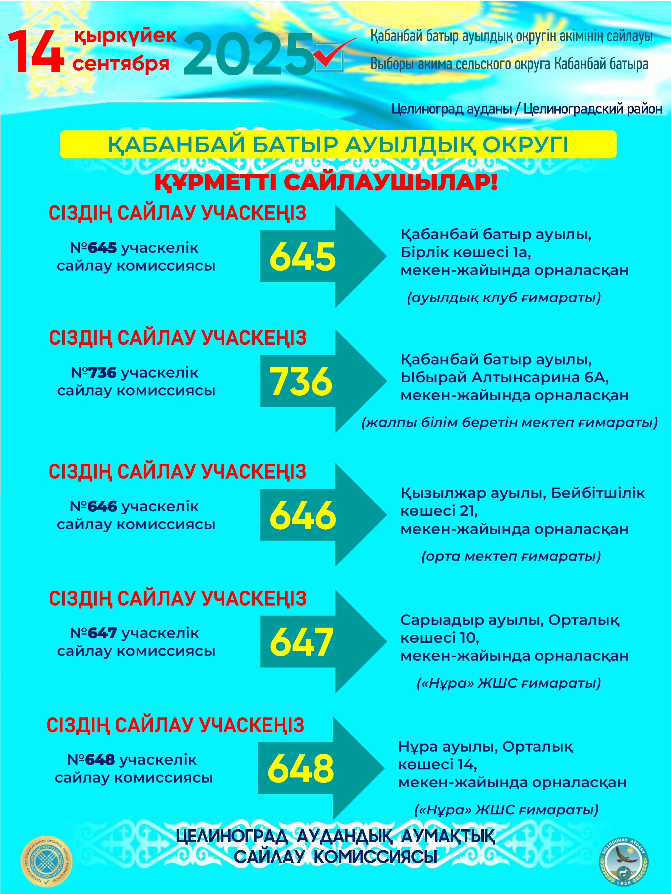 № 736 учаскелік сайлау комиссиясы – Қабанбай батыр ауылы, Ыбырай Алтынсарина 6А, орта мектеп ғимараты;