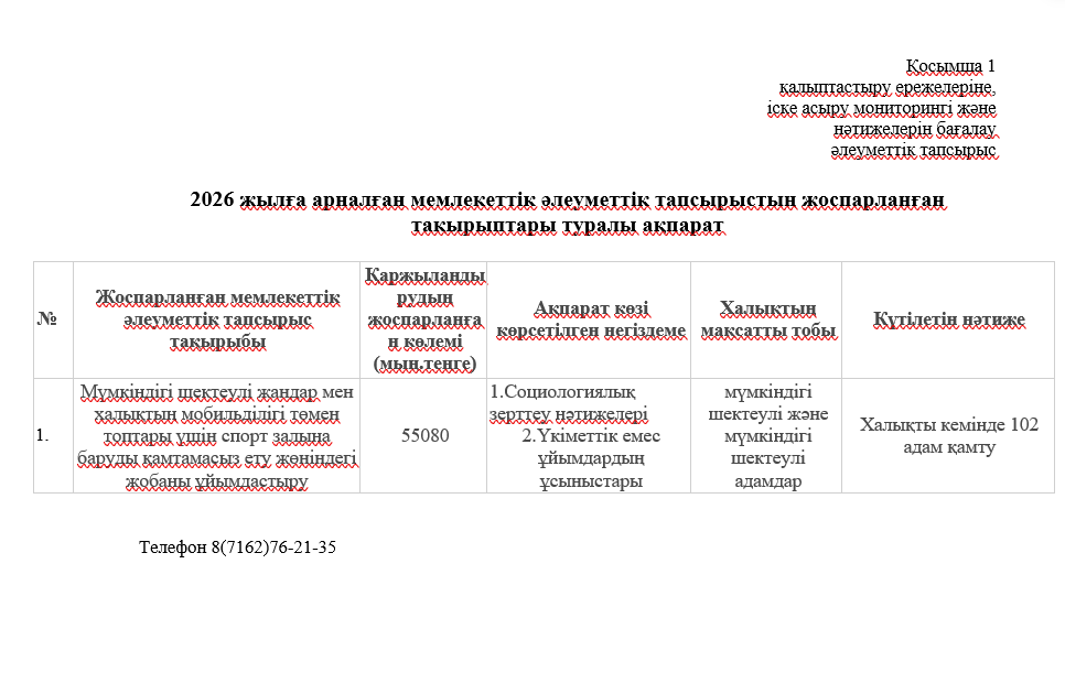 Ақмола облысының дене шынықтыру және спорт басқармасы Қазақстан Республикасы Қоғамдық даму министрінің 2018 жылғы 15 тамыздағы № 18 бұйрығымен (Нормативтік құқықтық актілерді мемлекеттік тіркеу тізілімінде № 17315 болып тіркелген) бекітілген Мемлекеттік әлеуметтік тапсырысты қалыптастыру, іске асыру мониторингі және нәтижелерін бағалау қағидаларына сәйкес мемлекеттік әлеуметтік тапсырыс тақырыбын жария талқылаудың басталғаны туралы хабарлайды 2026 жыл мынадай нысан бойынша: