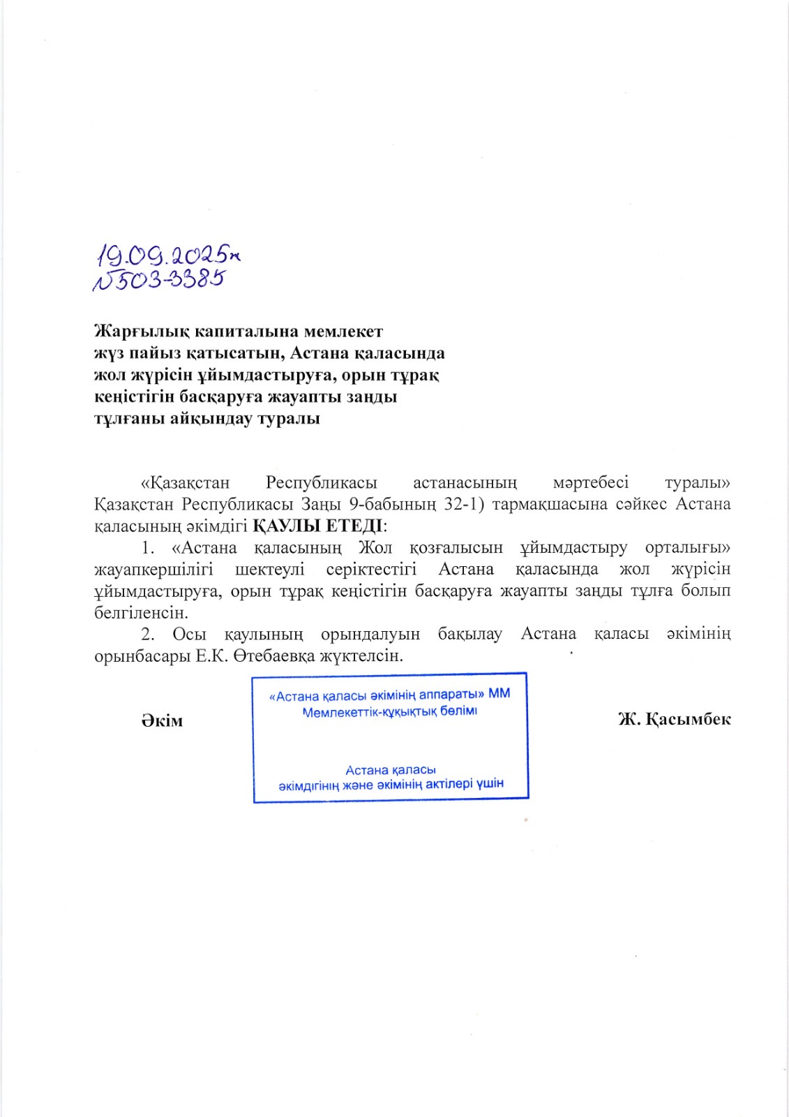 Астана қаласы әкімдігінің 2025 жылғы 19 қыркүйектегі № 503-3385 «Жарғылық капиталына мемлекет жүз пайыз қатысатын, Астана қаласында жол жүрісін ұйымдастыруға, орын тұрақ кеңістерінбасқаруға жауапты заңды тұлғаны анықтау туралы» қаулысымен «Астана қаласының Жол қозғалысын ұйыдастыру орталығы» ЖШС Астана қаласында жол жүрісін ұйымдастыруға , орын тұрақ кеңістерін басқаруға жауапты заңды тұлға болып белгіленді.