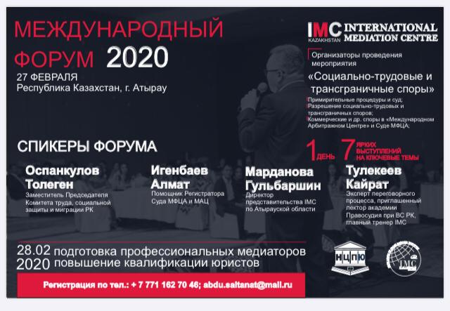 27 февраля текущего года в г. Атырау состоится кластерный форум общественного объединения по дальнейшему развитию института медиации с разрешением социальных, трудовых и пограничных споров.