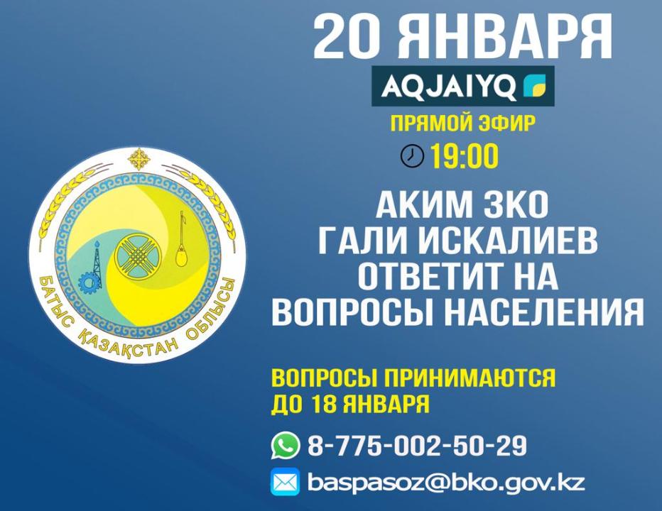 На самые острые вопросы 20 января 2022 года в прямом эфире телеканала «Aqjaiyq» ответит аким области Гали Искалиев, а также руководители компетентных органов.