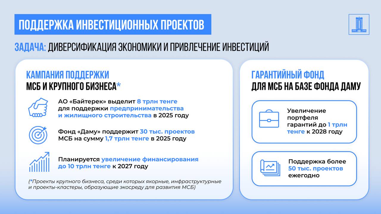 В 2025 году АО «Национальный управляющий холдинг «Байтерек» направит 8 трлн тенге на поддержку предпринимательства, развитие жилищного строительства и реализацию ключевых национальных и инвестиционных проектов с дальнейшим увеличением объема финансирования до 10 трлн тенге к 2027 году. В рамках масштабного финансирования запускаются новые механизмы поддержки, направленные на развитие бизнеса, экспортных возможностей, расширяются инструменты финансирования и социальных инициатив, среди которых: