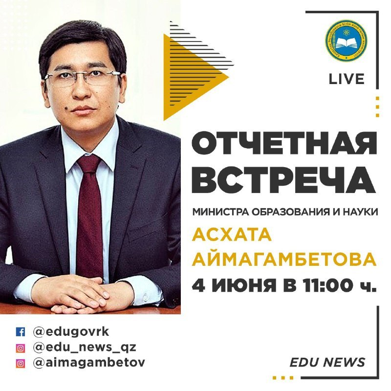 4 июня 2020 года в 11:00 ч. состоится отчетная встреча Министра образования и науки Республики Казахстан Асхата Аймагамбетова с населением.