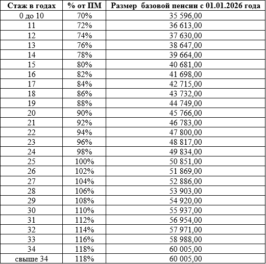 В связи с этим, с 1 января 2026 года размер базовой пенсионной выплаты устанавливается в размере 70 процентов от величины ПМ – при наличии десяти и менее лет стажа участия в пенсионной системе либо его отсутствии, с увеличением ее размера за каждый полный год стажа участия в пенсионной системе сверх десяти лет на 2 процента, но не более 118 процентов от величины ПМ. Максимальный размер базовой пенсии при наличии стажа 34 лет и более с 01.01.2026г. составит 60005 тенге.