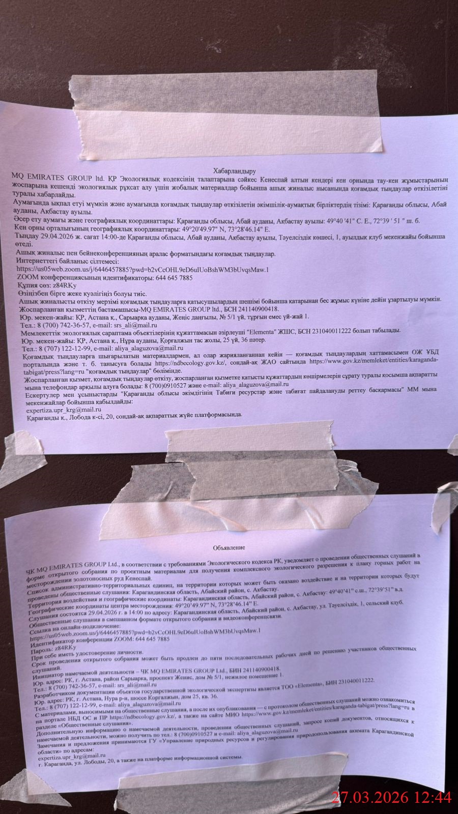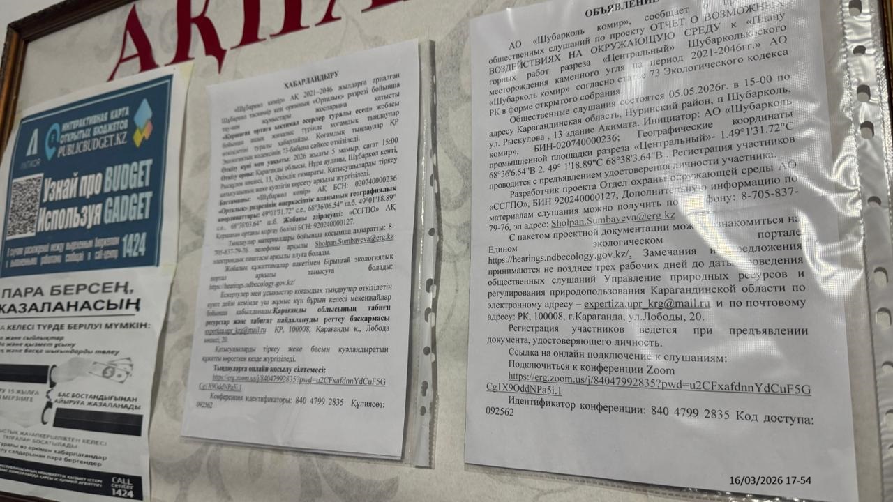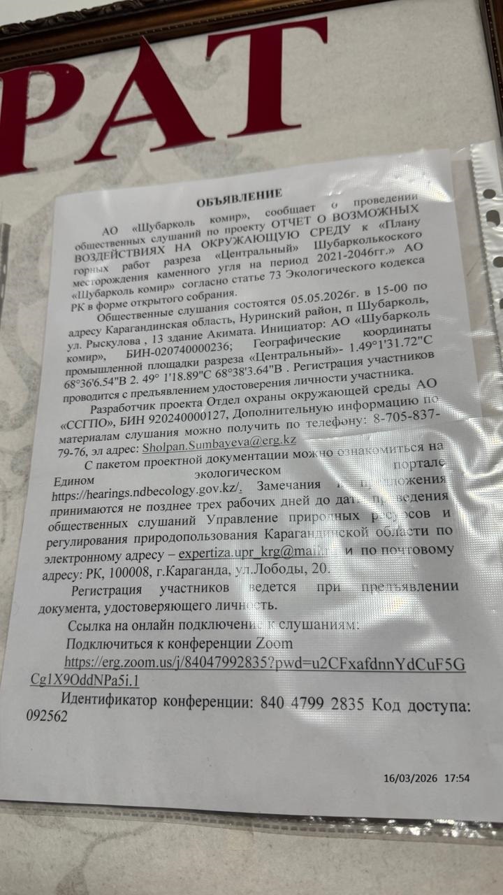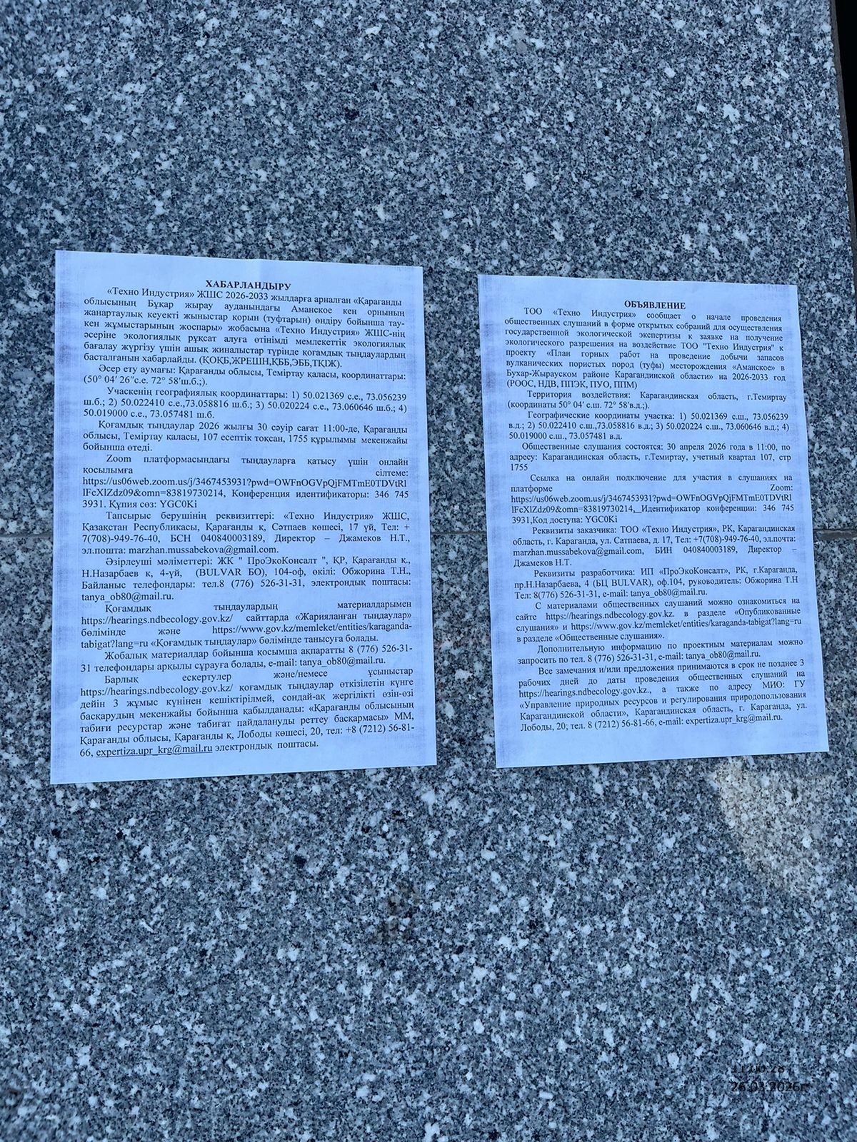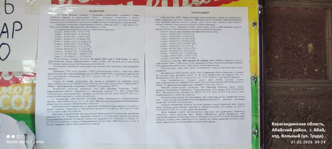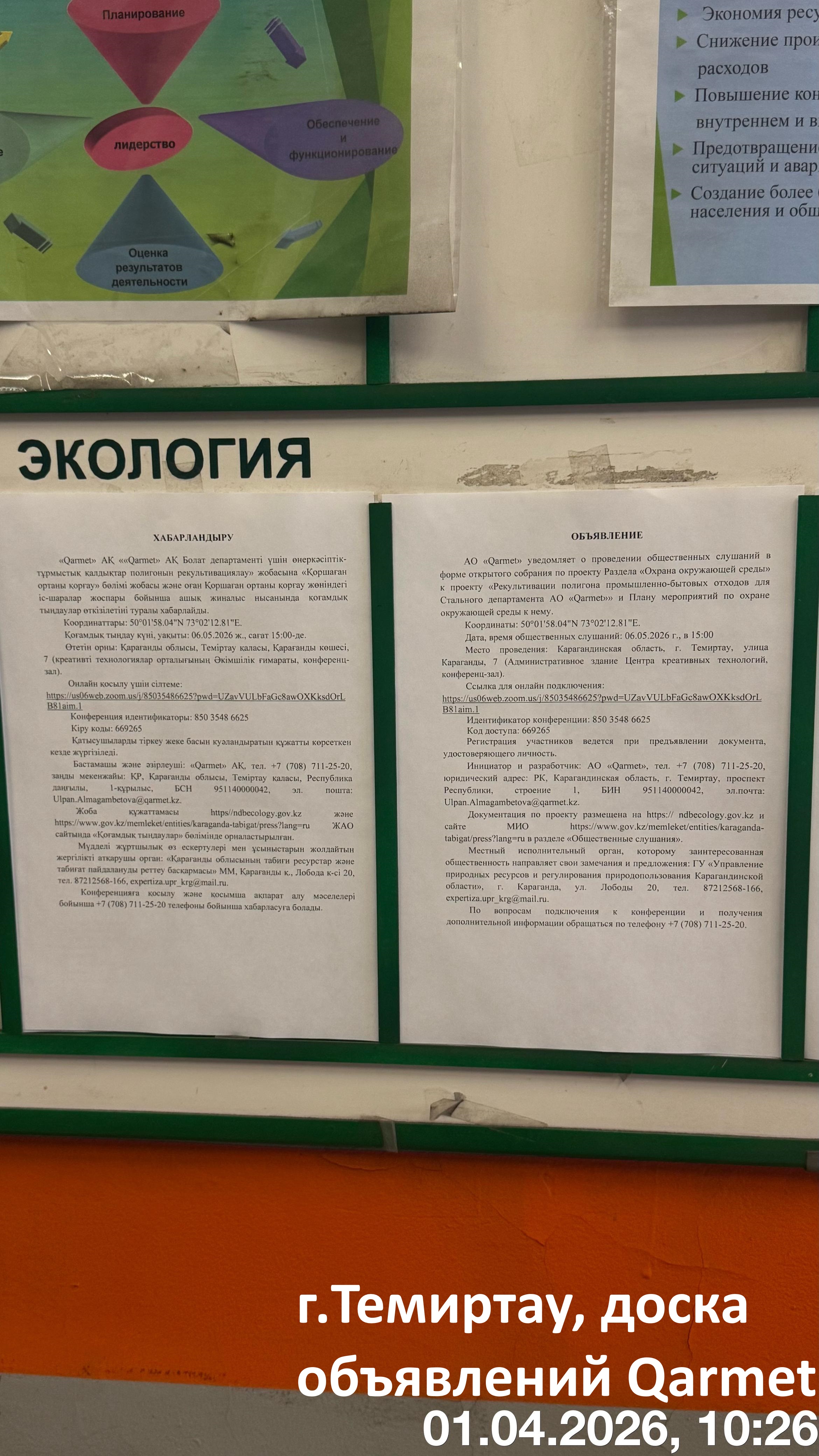 Общественные слушания состоятся 4 мая 2026 г. в 11.00 часов, по адресу: г. Темиртау, 7 микрорайон, 50а, офис 3. Участие в слушаниях можно принять посредством подключения к видеоконференцсвязи. Ссылка на онлайн подключение на платформу Zoom: https://us04web.zoom.us/j/9465270690?pwd=k9Cy6pVm6aGyzrdX2hSi5Fr9KRkyhI.1&omn=72895888750. Идентификатор конференции: 946 527 0690. Пароль: 5fV55E.