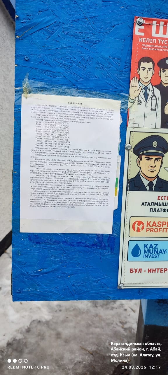 Общественные слушания состоятся: 28 апреля 2026 года в 11:00 часов, по адресу: Карагандинская область, Абайский район, г.Абай, ул.Абая, д.26, актовый зал (2 этаж) здания ГУ «Аппарат акима города Абай Карагандинской области».