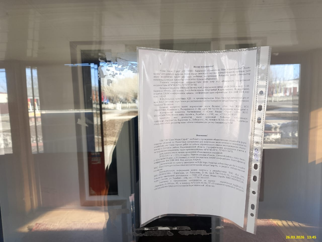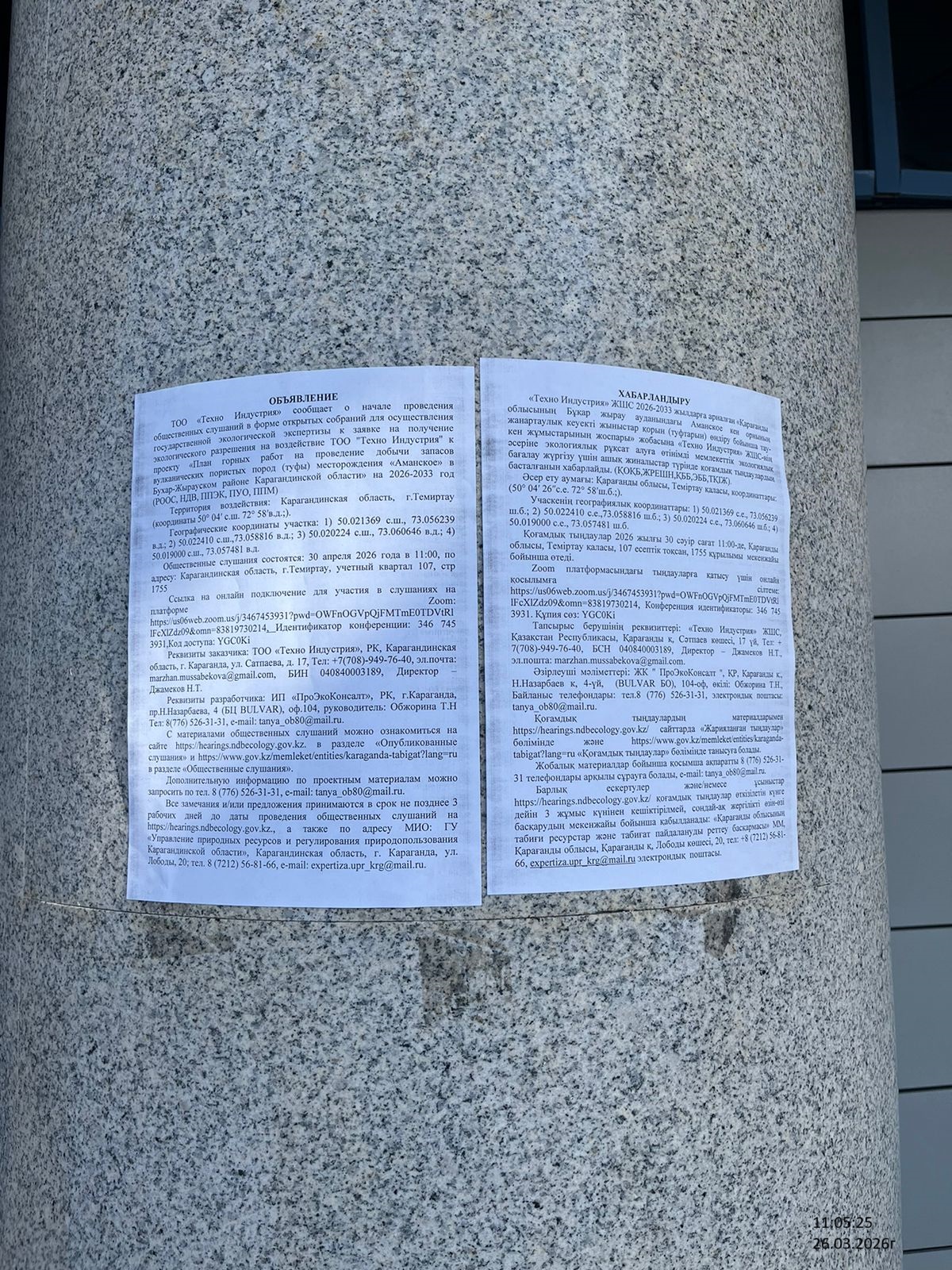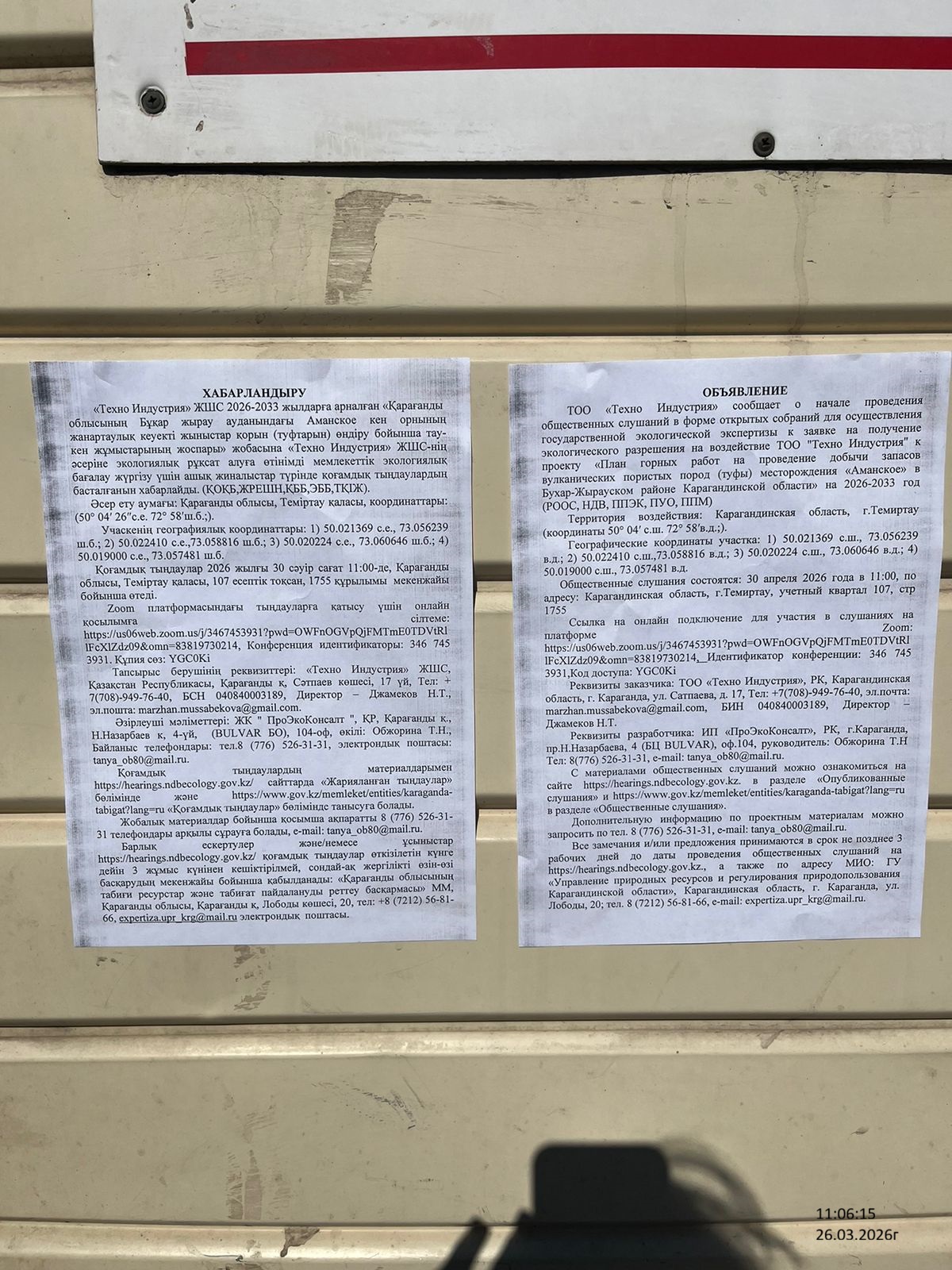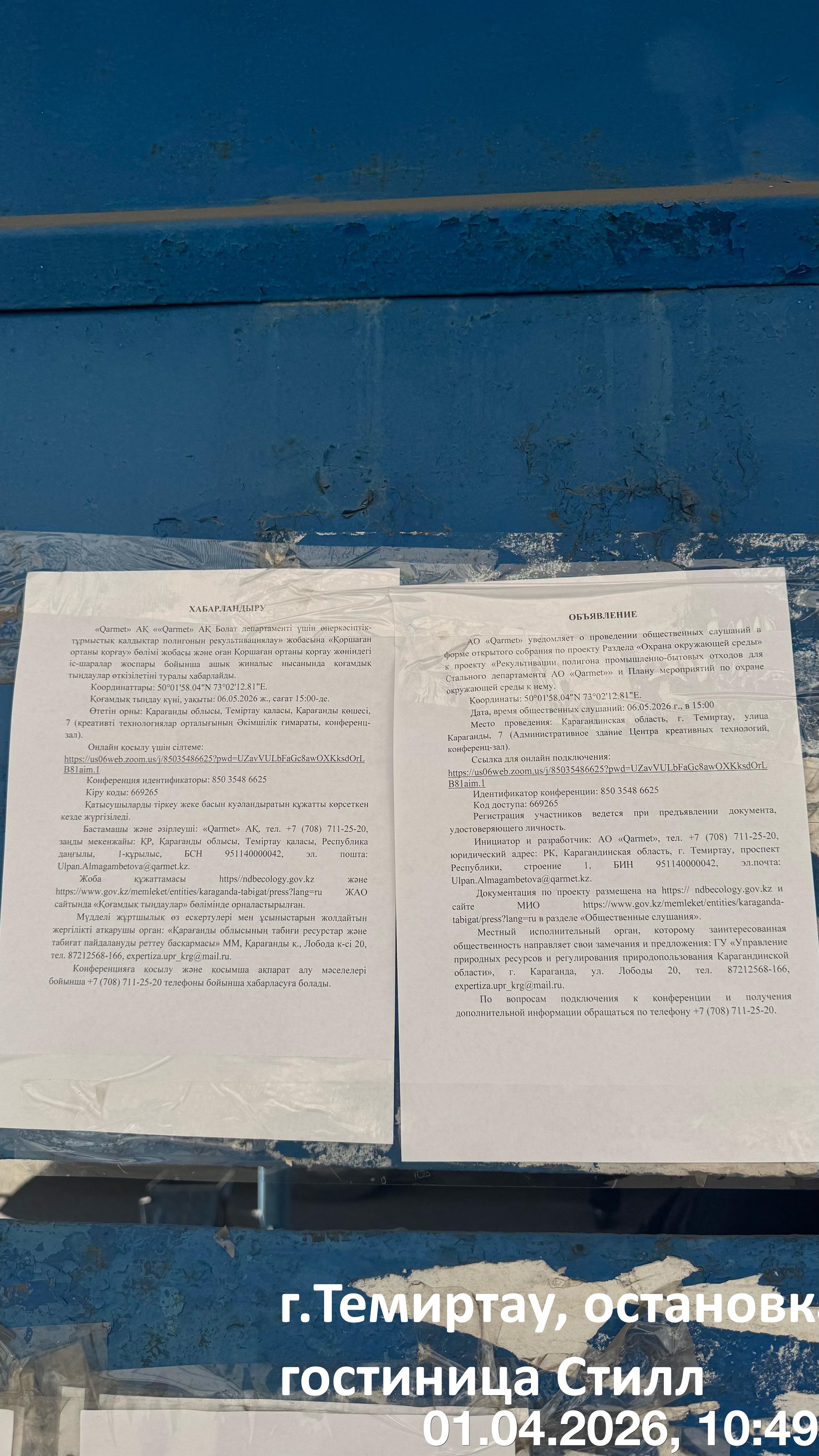Общественные слушания состоятся: 30 апреля 2026 года в 11:00, по адресу: Карагандинская область, г.Темиртау, учетный квартал 107, стр 1755
