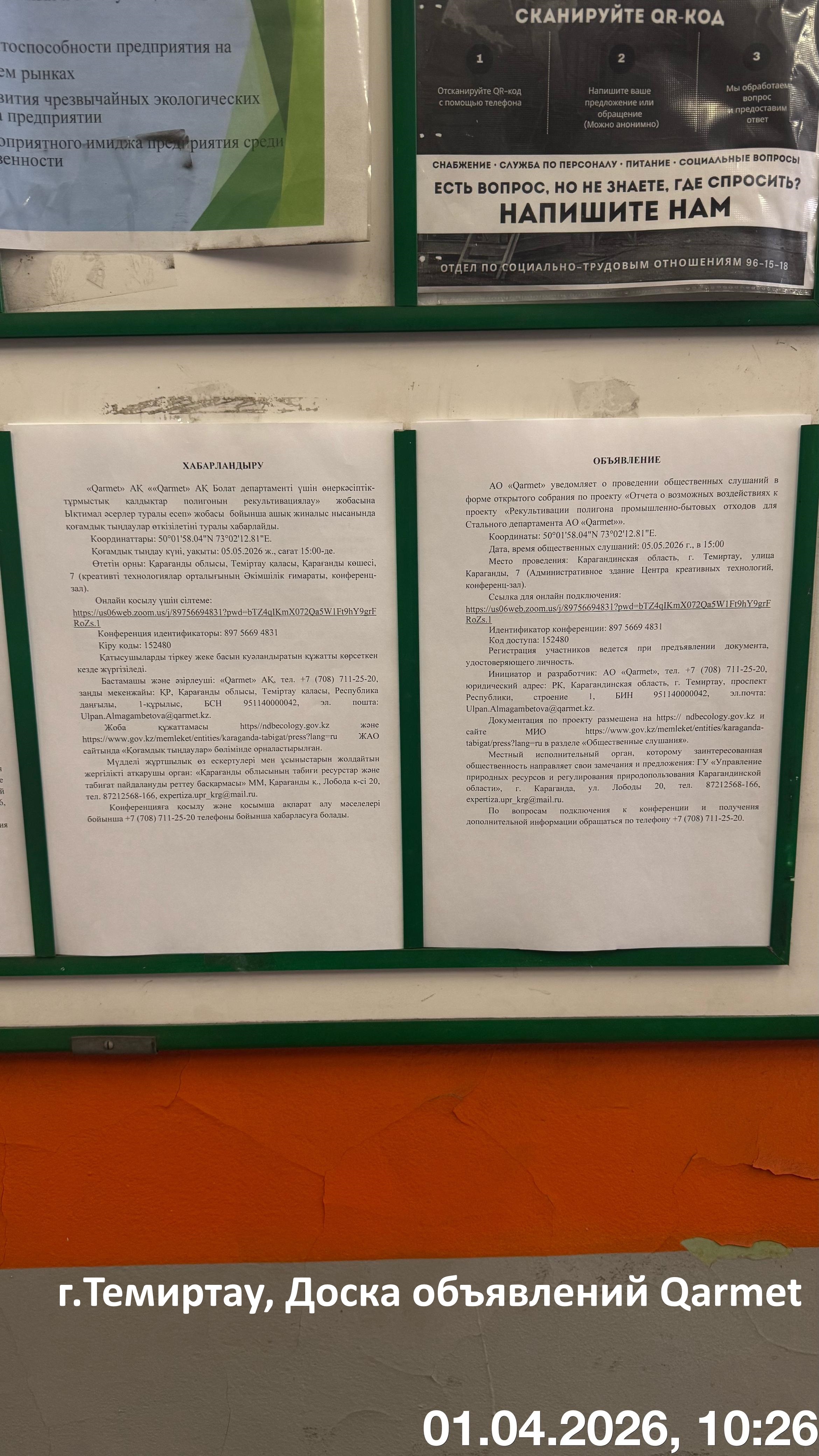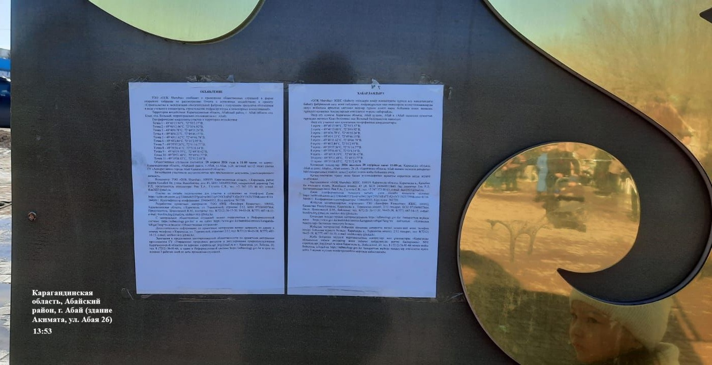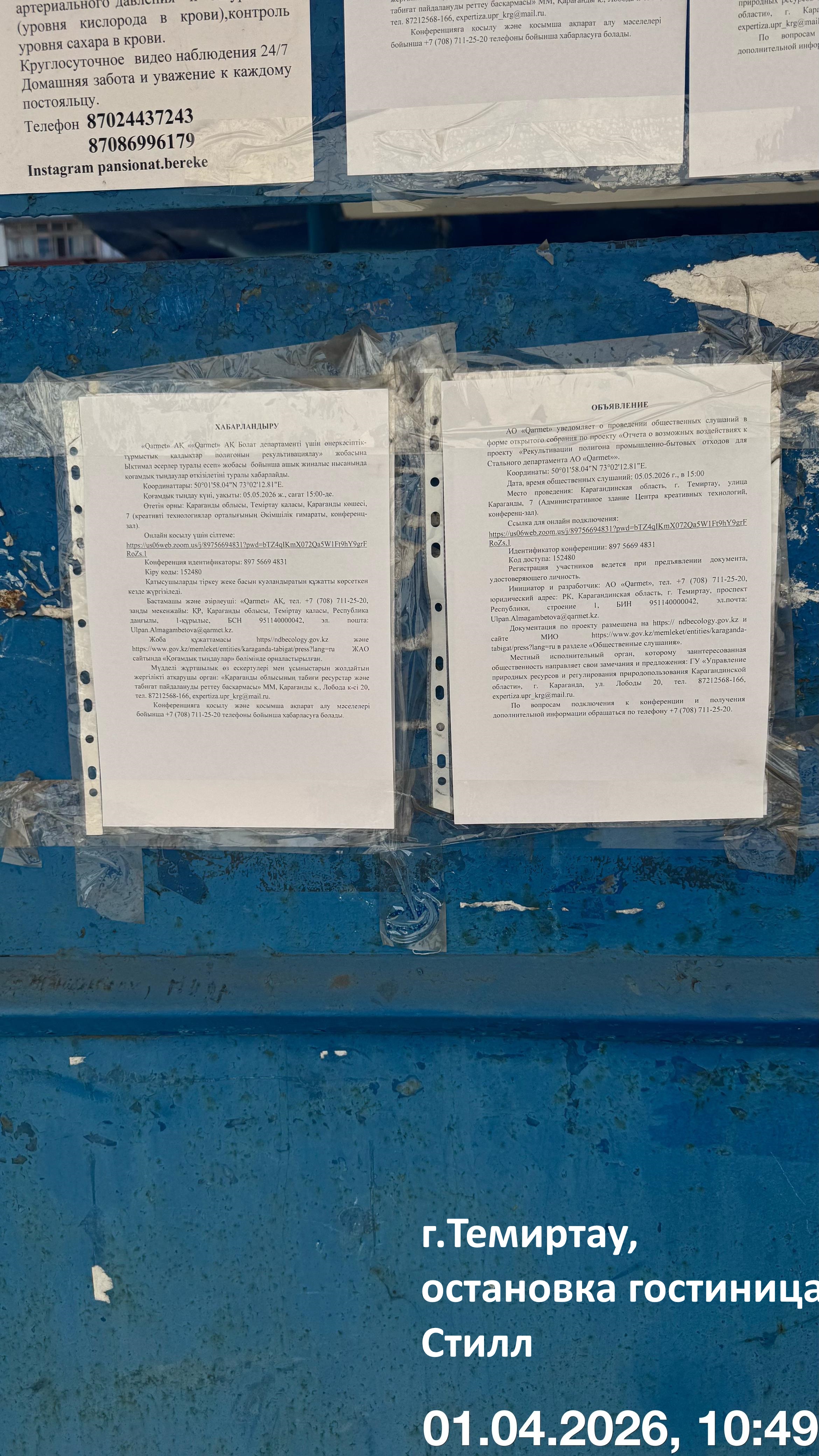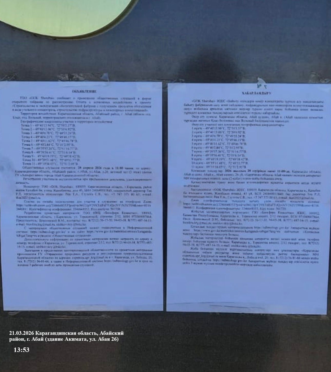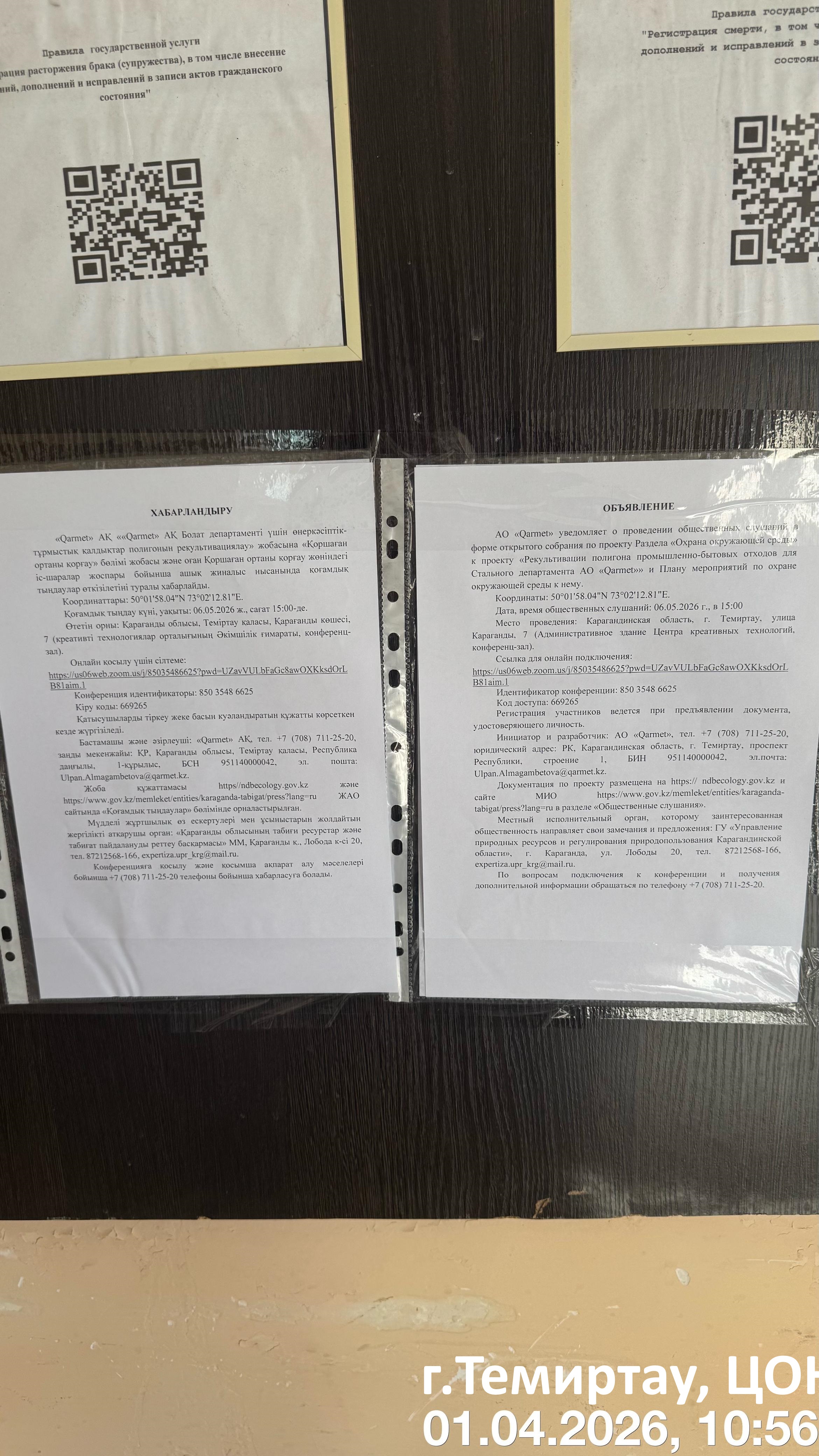 Общественные слушания состоятся: 30 апреля 2026 года в 11:00, по адресу: Карагандинская область, г.Темиртау, учетный квартал 107, стр 1755