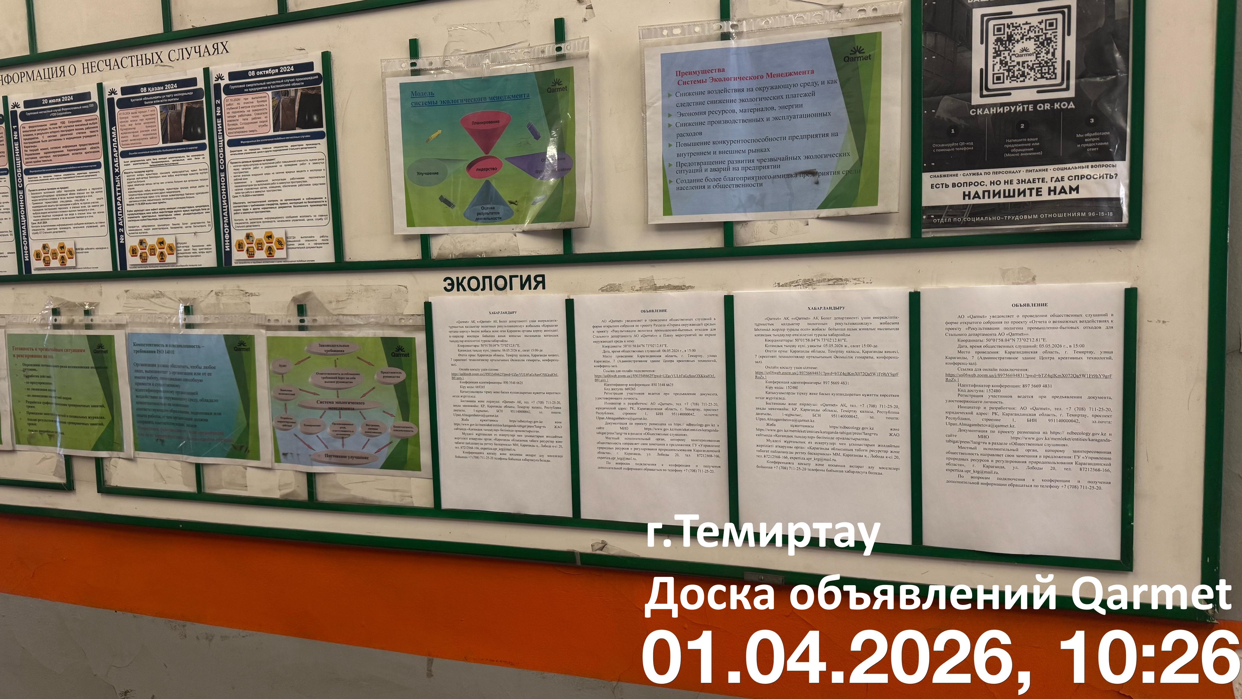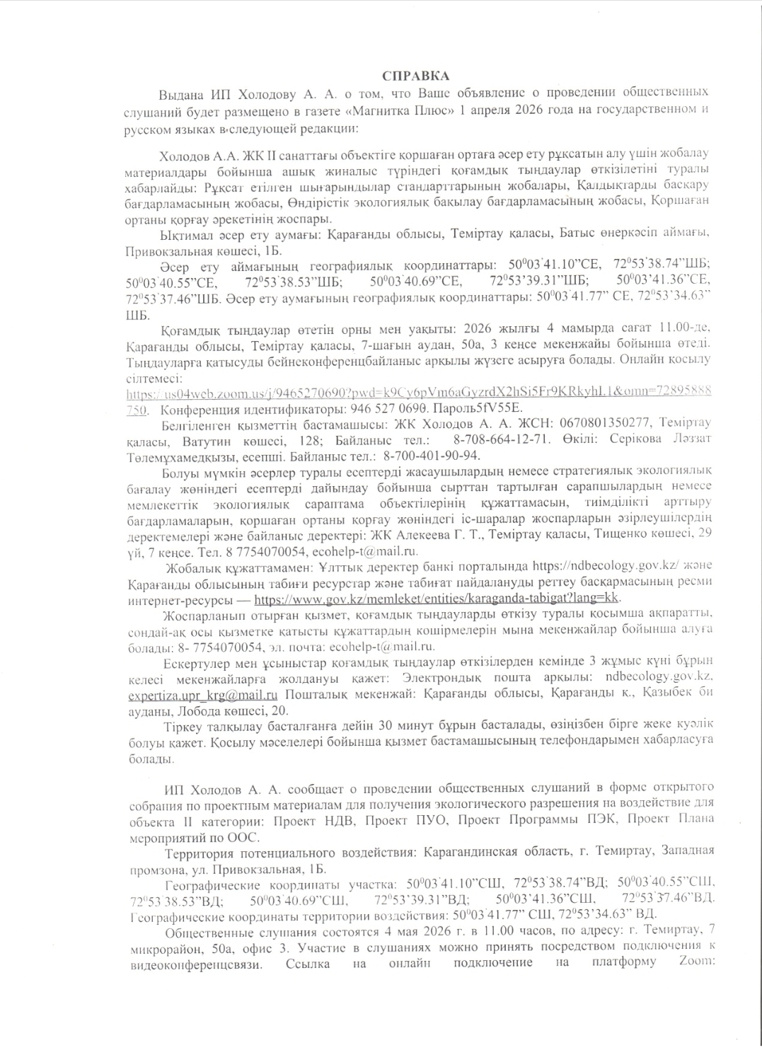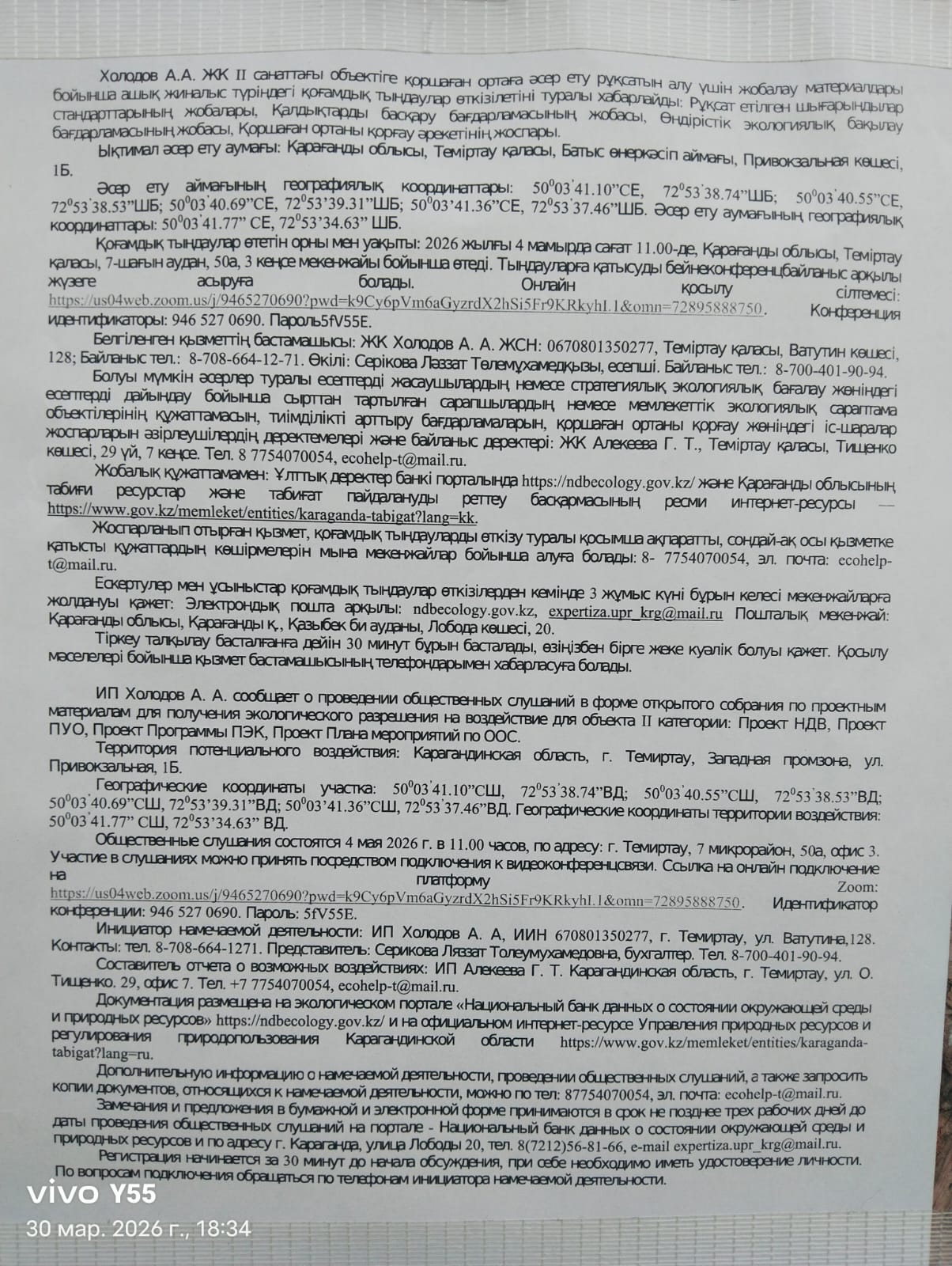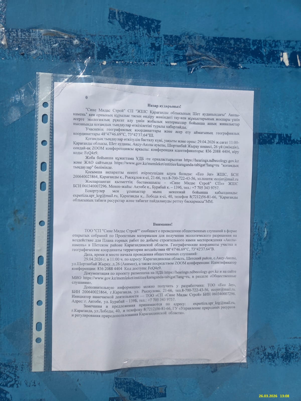 Общественные слушания состоятся: 30 апреля 2026 года в 11:00, по адресу: Карагандинская область, г.Темиртау, учетный квартал 107, стр 1755