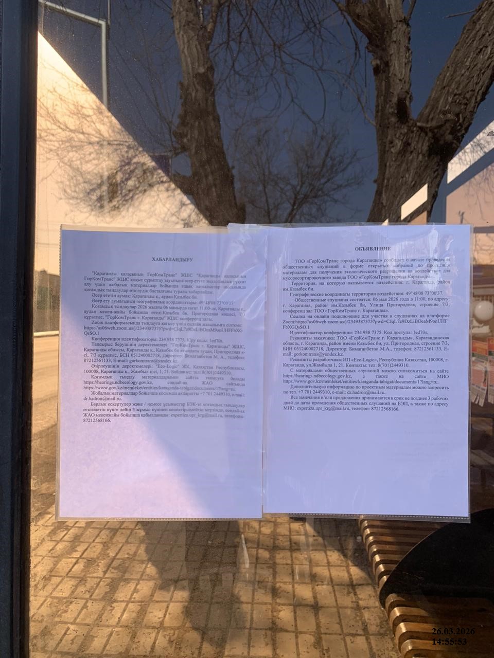 Общественные слушания состоятся: 06 мая 2026 года в 11:00, по адресу: г. Караганда, район им.Казыбек би, Улица Пригородная, строение 7/3, конференц зал ТОО «ГорКомТранс г. Караганды».