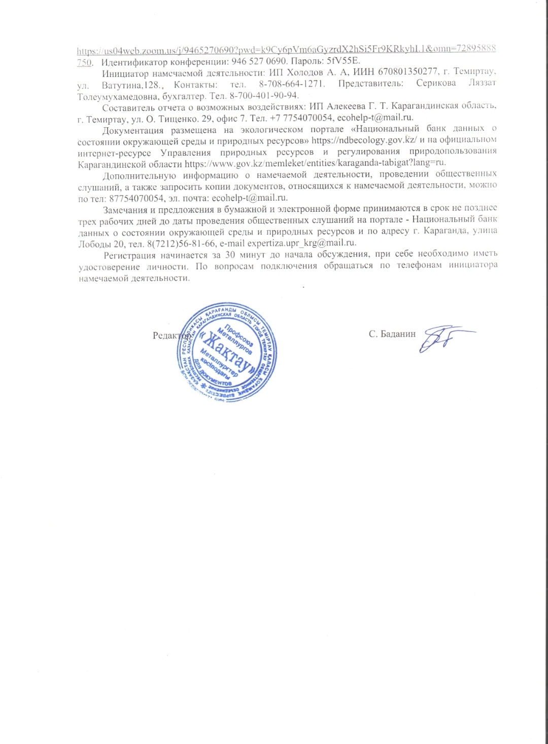 Составитель отчета о возможных воздействиях: ИП Алекеева Г. Т. Карагандинская область, г. Темиртау, ул. О. Тищенко. 29, офис 7. Тел. +7 7754070054, ecohelp-t@mail.ru.