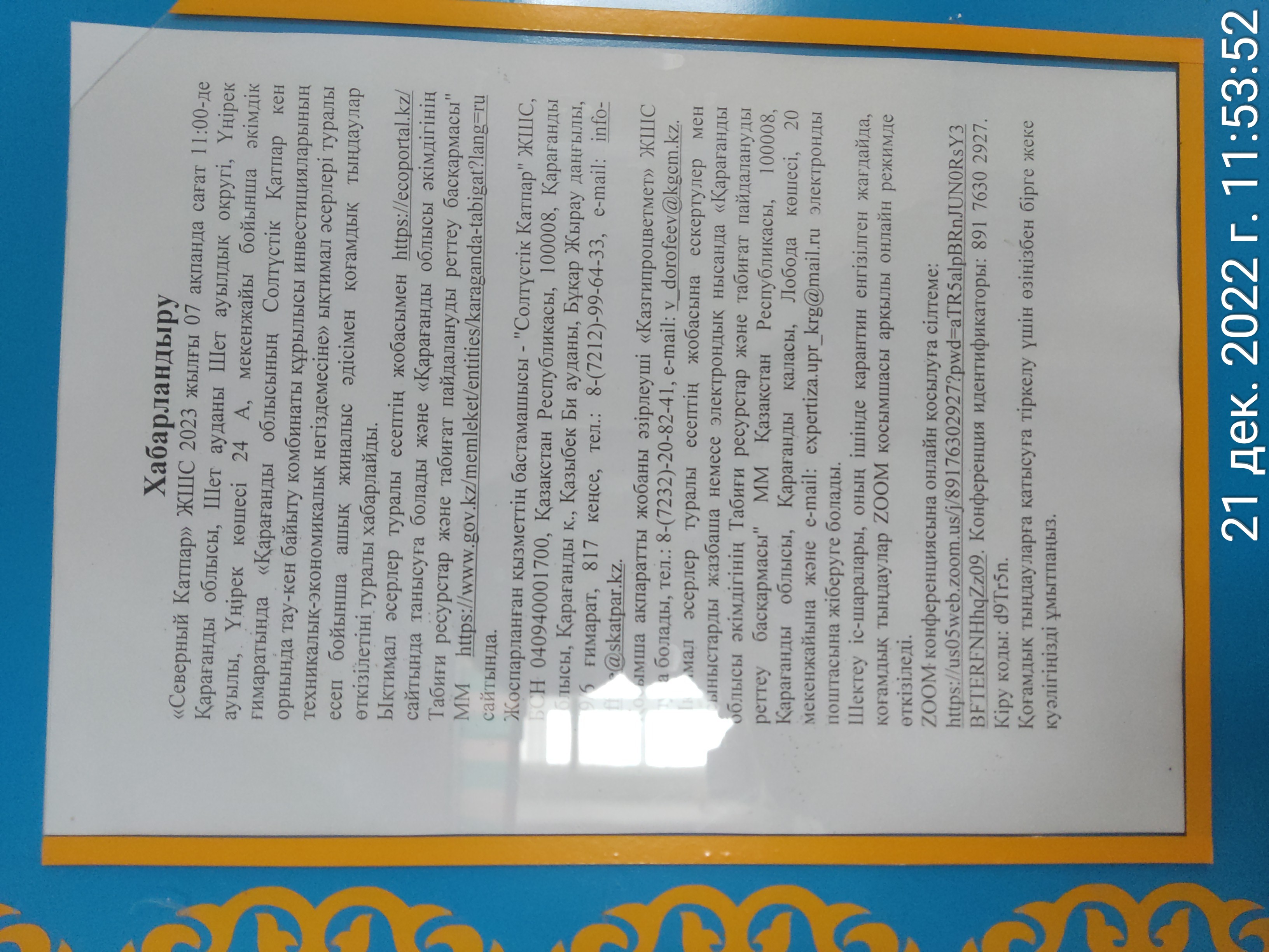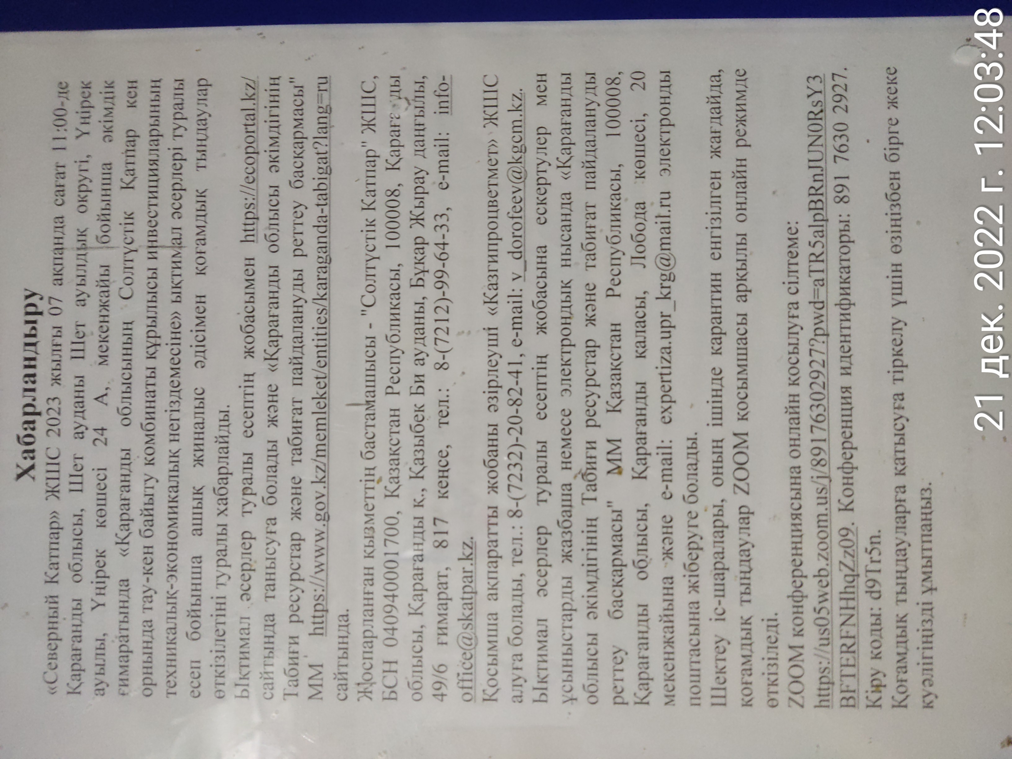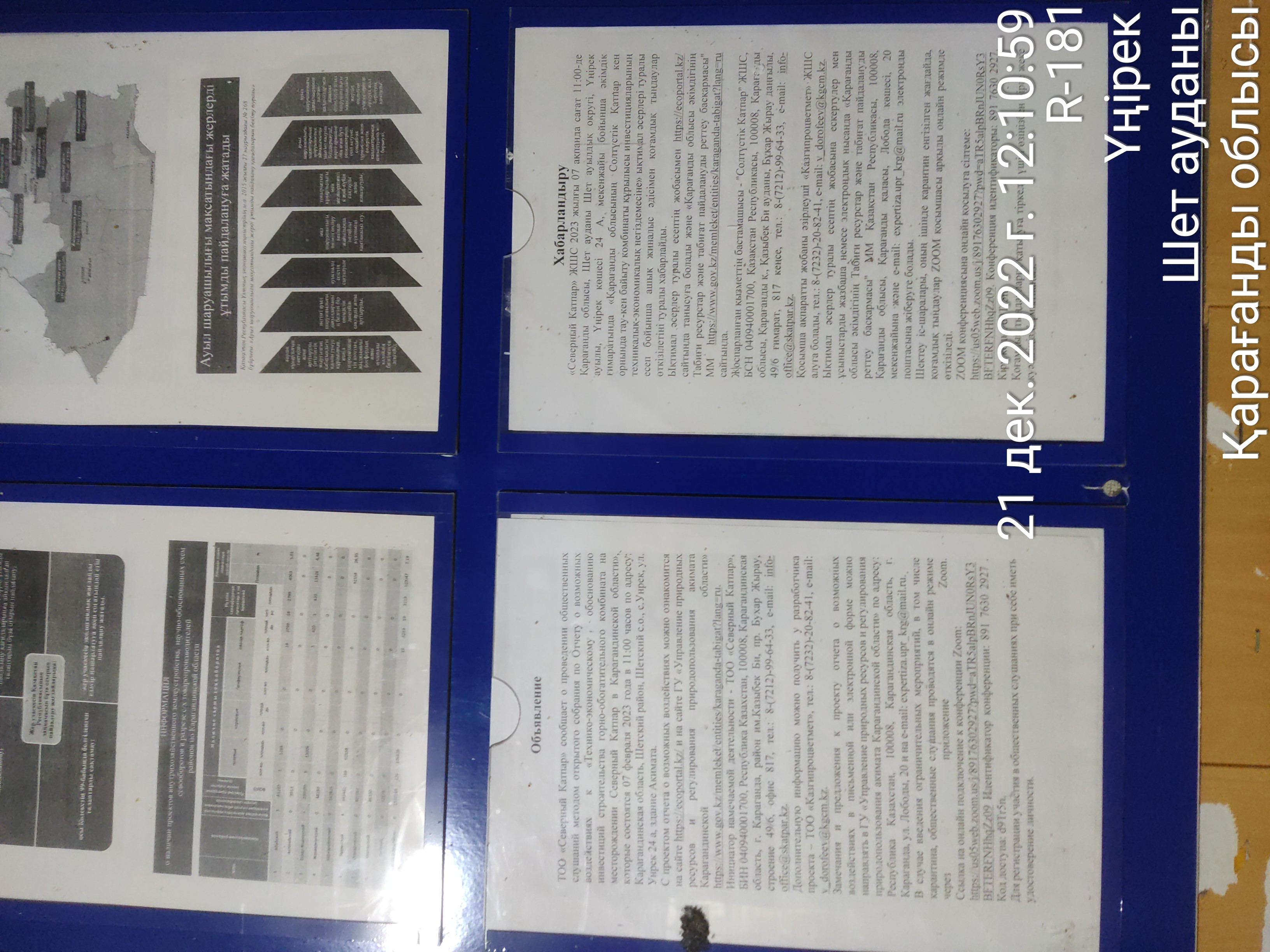 С материалами, выносимыми на общественные слушания, а после и с опубликованным протоколом общественных слушаний, можно ознакомиться на сайте https://ecoportal.kz/ и на сайте ГУ «Управление природных ресурсов и регулирования природопользования акимата Карагандинской области» https://www.gov.kz/memleket/entities/karaganda-tabigat?lang=ru.