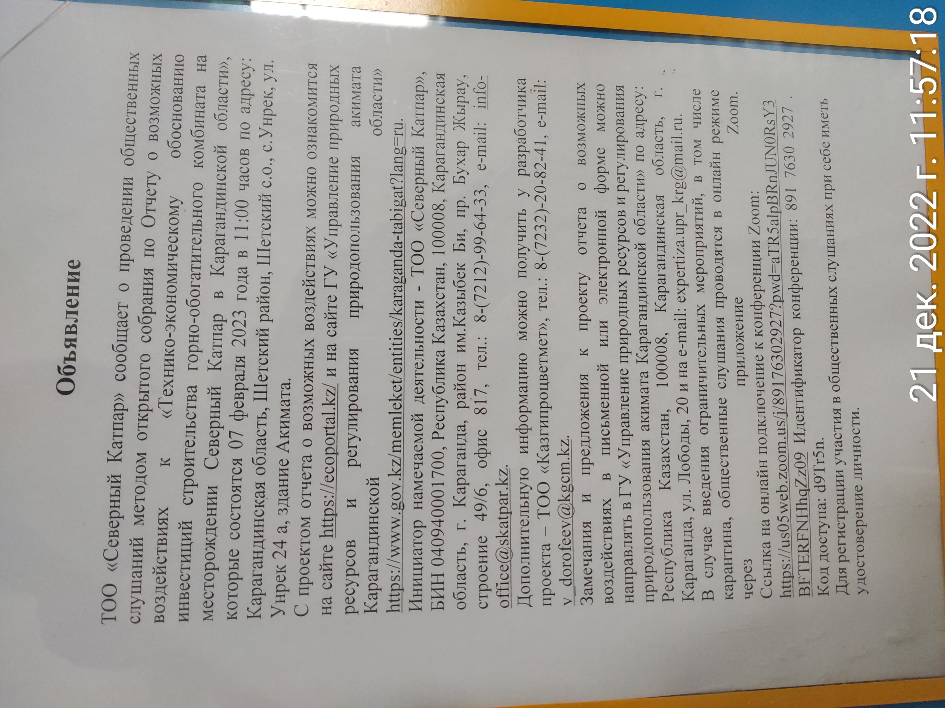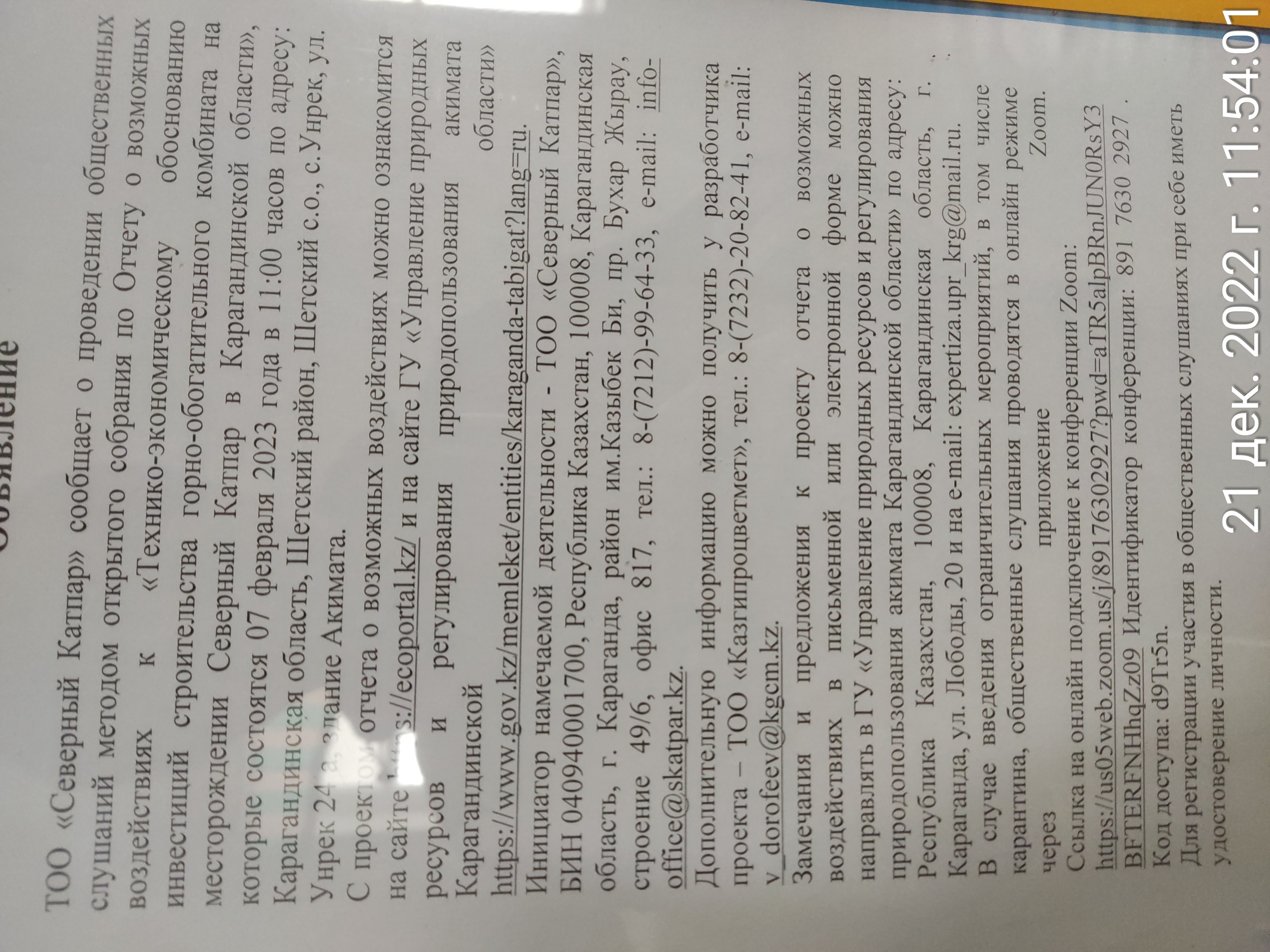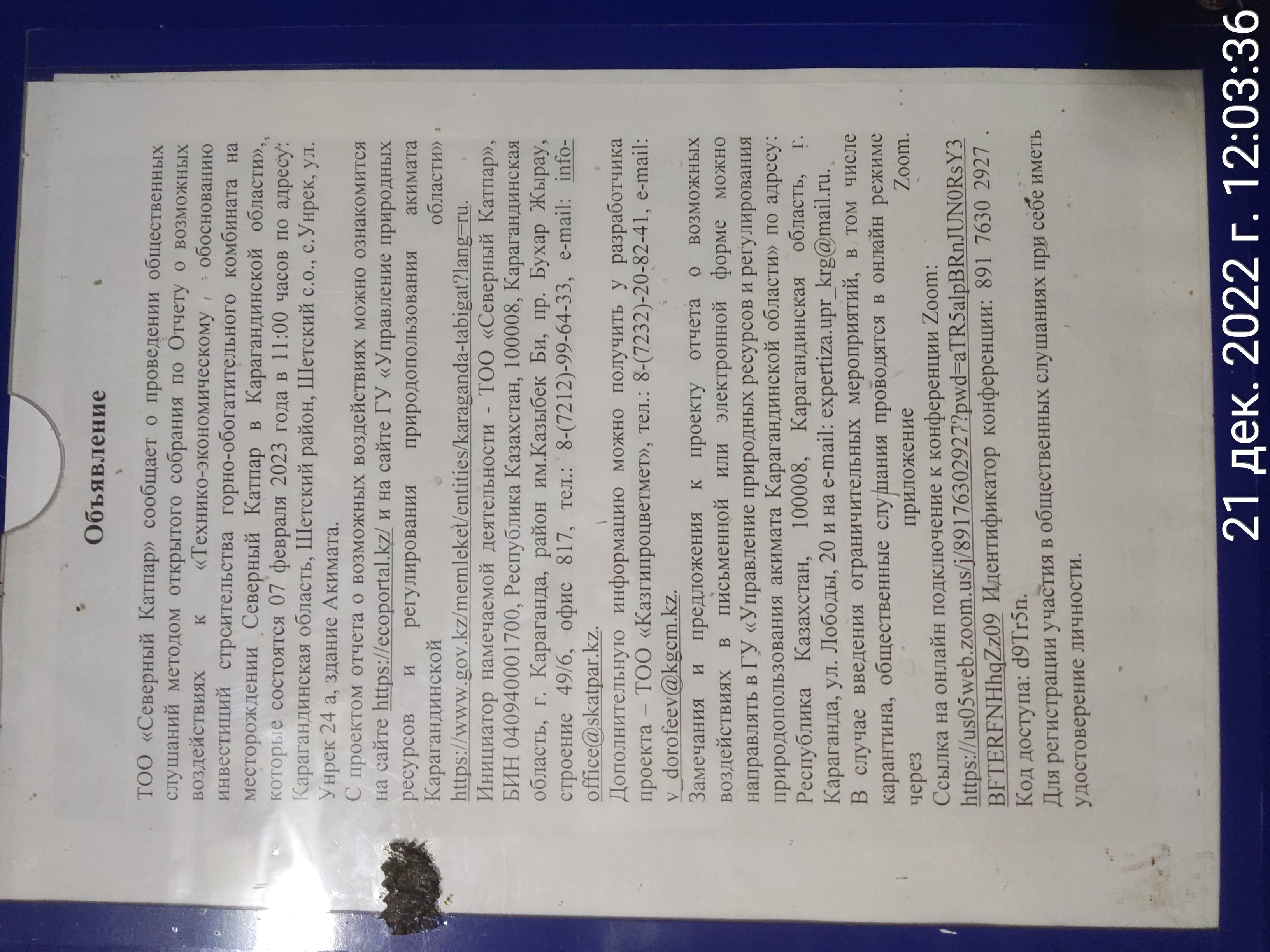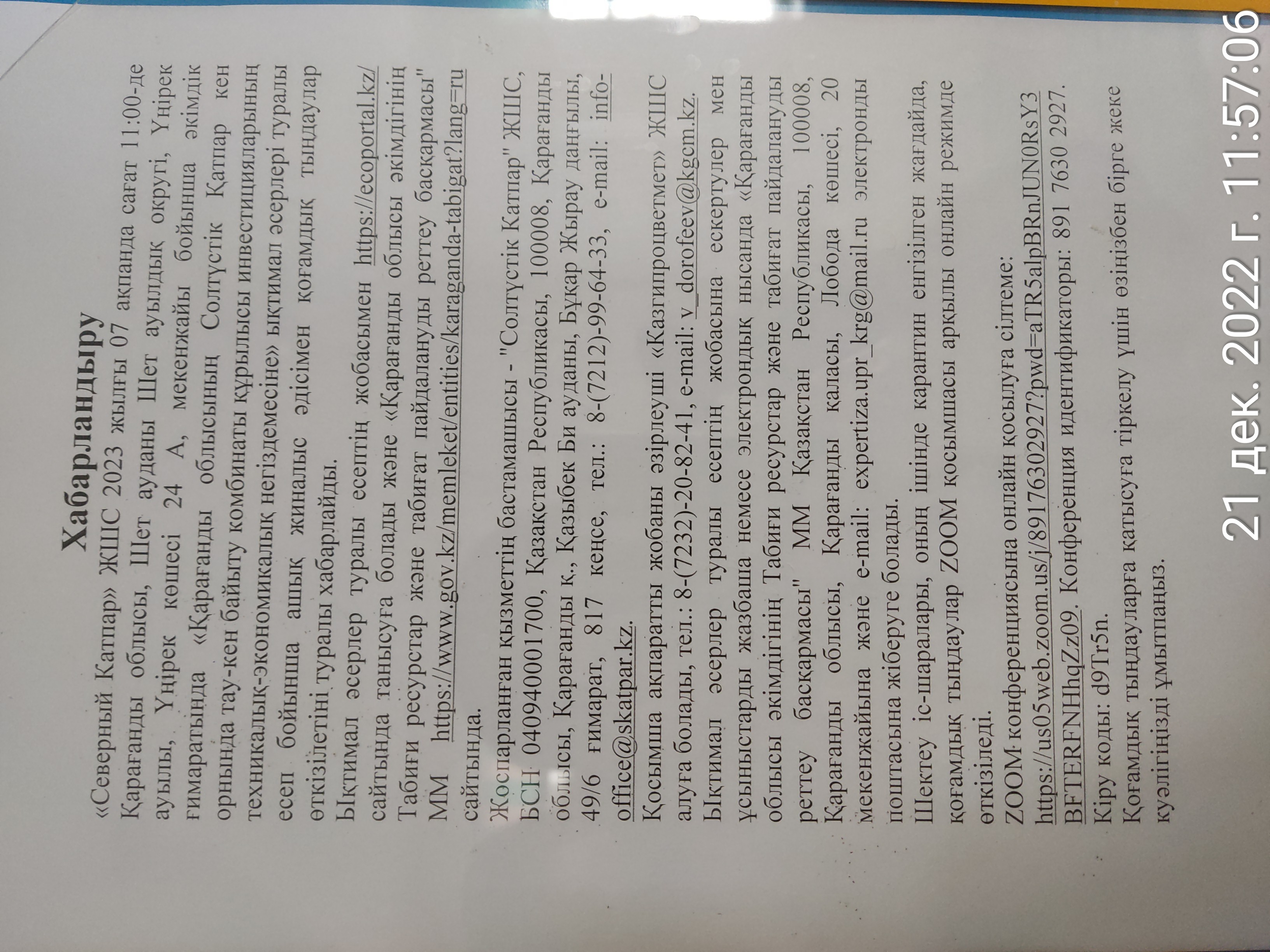 С материалами, выносимыми на общественные слушания, а после и с опубликованным протоколом общественных слушаний, можно ознакомиться на сайте https://ecoportal.kz/ и на сайте ГУ «Управление природных ресурсов и регулирования природопользования акимата Карагандинской области» https://www.gov.kz/memleket/entities/karaganda-tabigat?lang=ru.