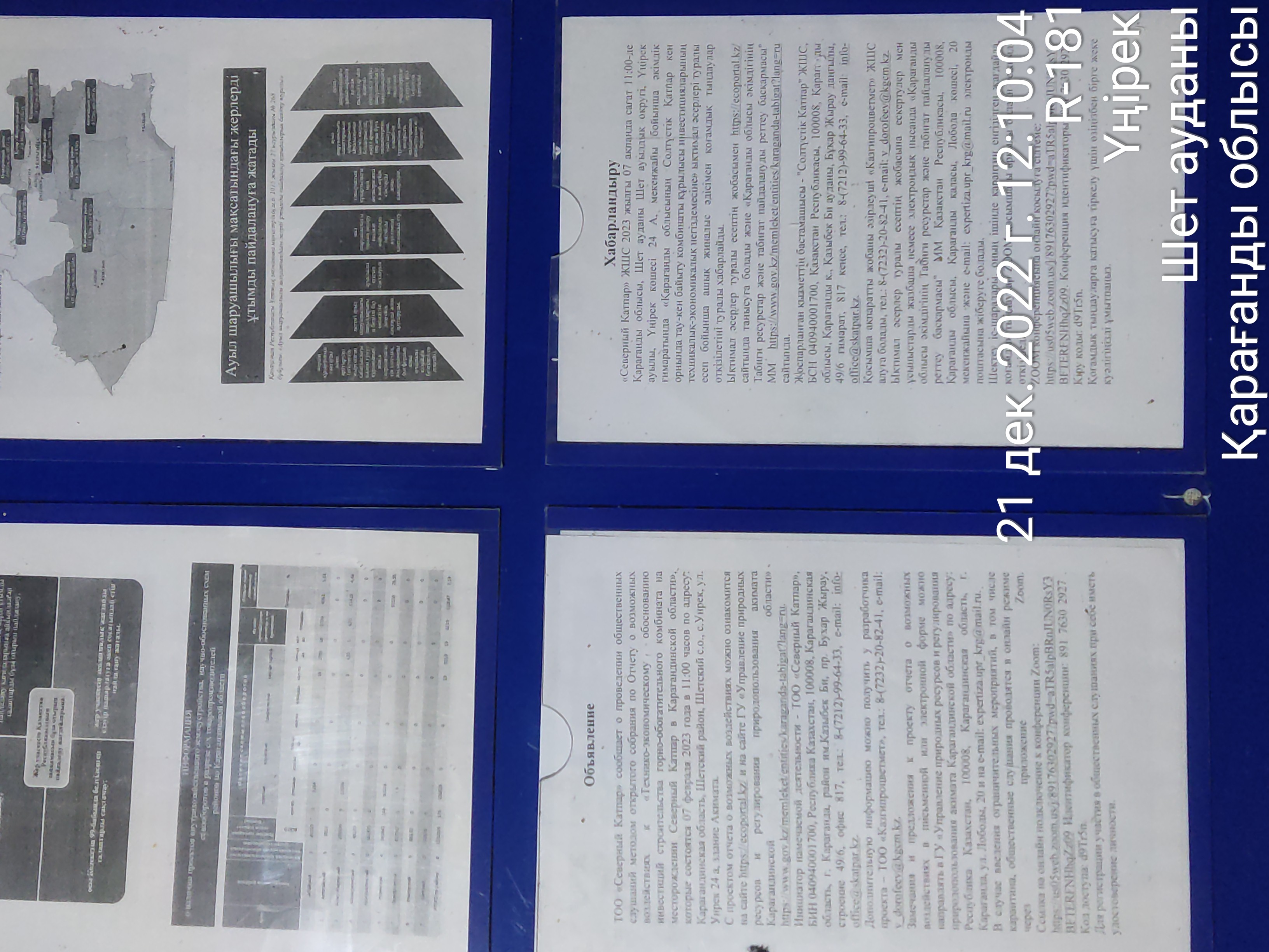 Общественные слушания методом открытого собрания планируется провести 07 февраля 2023 года в 11:00 часов по адресу: Карагандинская область, Шетский район, Шетский с.о., с.Унрек, ул. Унрек 24 а, здание Акимата.