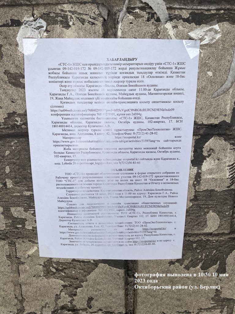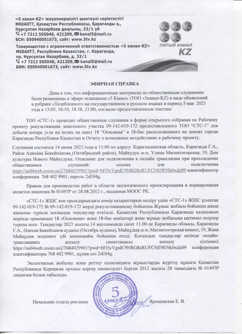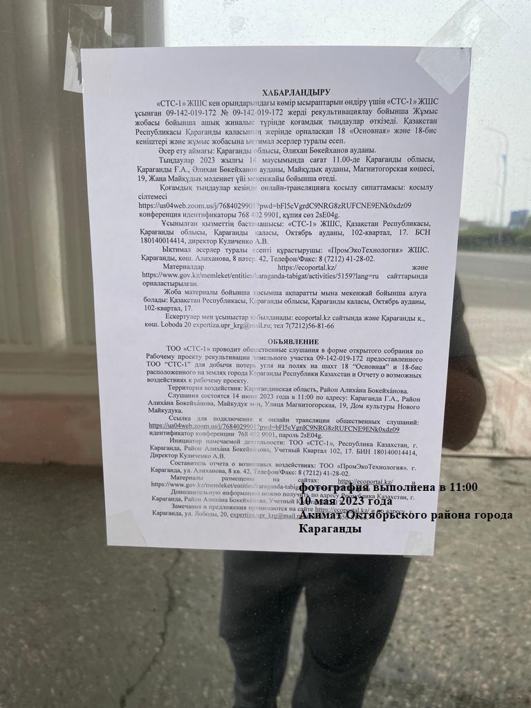 ТОО «СТС-1» проводит общественные слушания в форме открытого собрания по Рабочему проекту рекультивации земельного участка 09-142-019-172 предоставленного ТОО “СТС-1” для добычи потерь угля на полях на шахт 18 “Основная” и 18-бис расположенного на землях города Караганды Республики Казахстан и Отчету о возможных воздействиях к рабочему проекту.