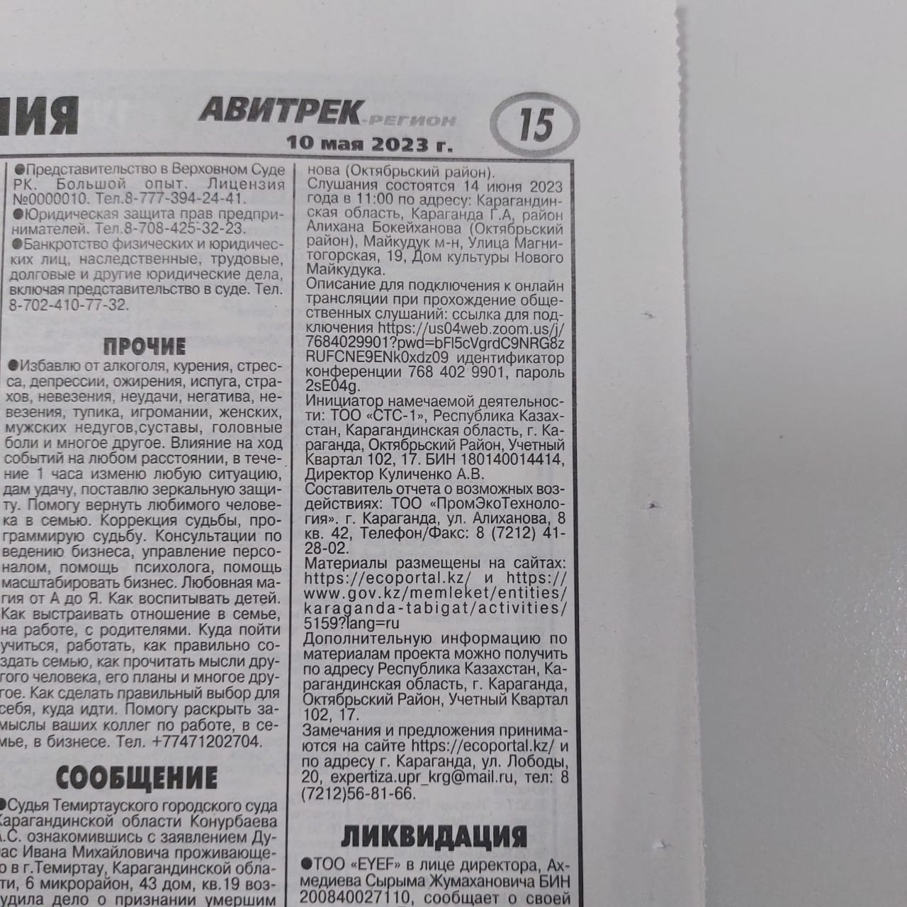 Слушания состоятся 14 июня 2023 года в 11:00 по адресу: Карагандинская область, Караганда Г.А., Район Алиха́на Бокейха́нова (Октябрьский район), Майкудук м-н, Улица Магнитогорская, 19, Дом культуры Нового Майкудука.