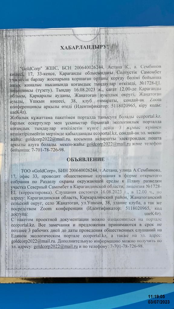 Слушания состоятся 16.08.2023 г., в 12.00 ч., по адресу: Карагандинская область, Каркаралинский район, Жанатоганский сельский округ, село Жанатоган, ул.Ушкын, 38, здание клуба, а так же посредством Zoom конференции (Идентификатор: 5118020965, код доступа: uaeK4z).