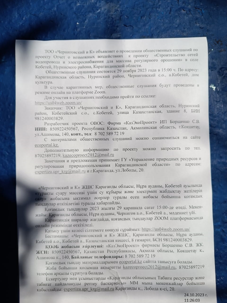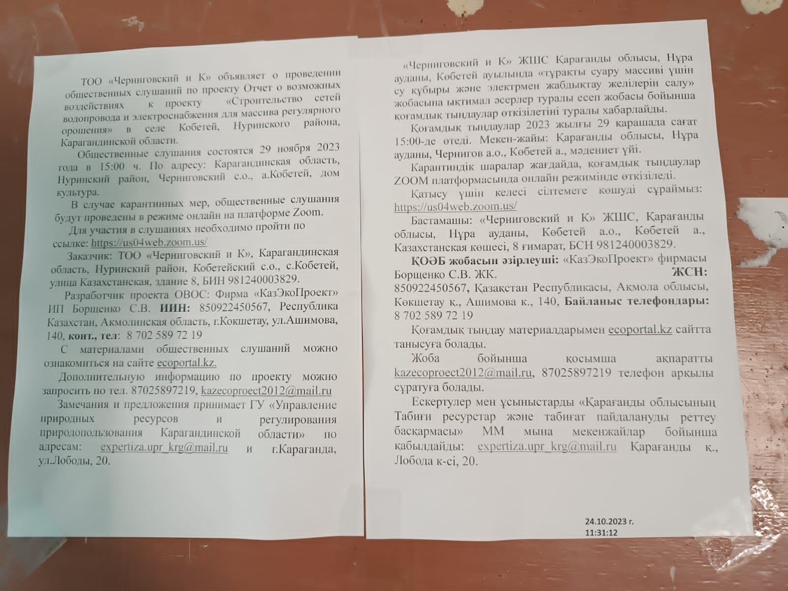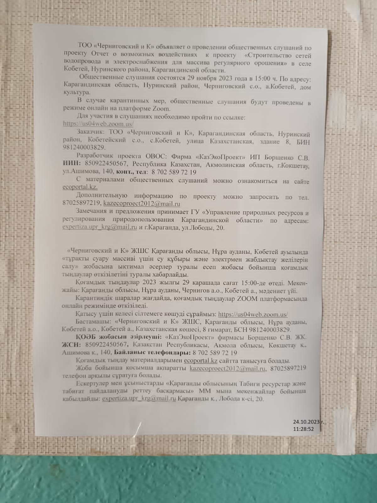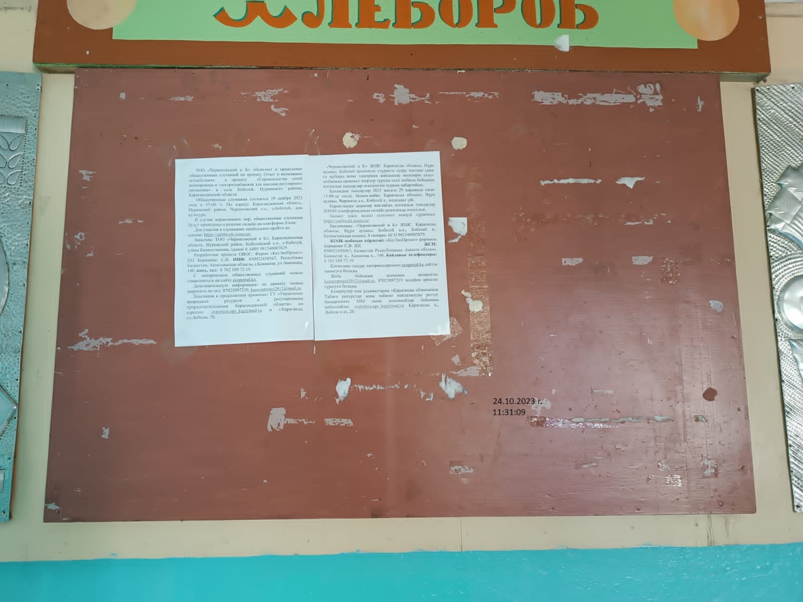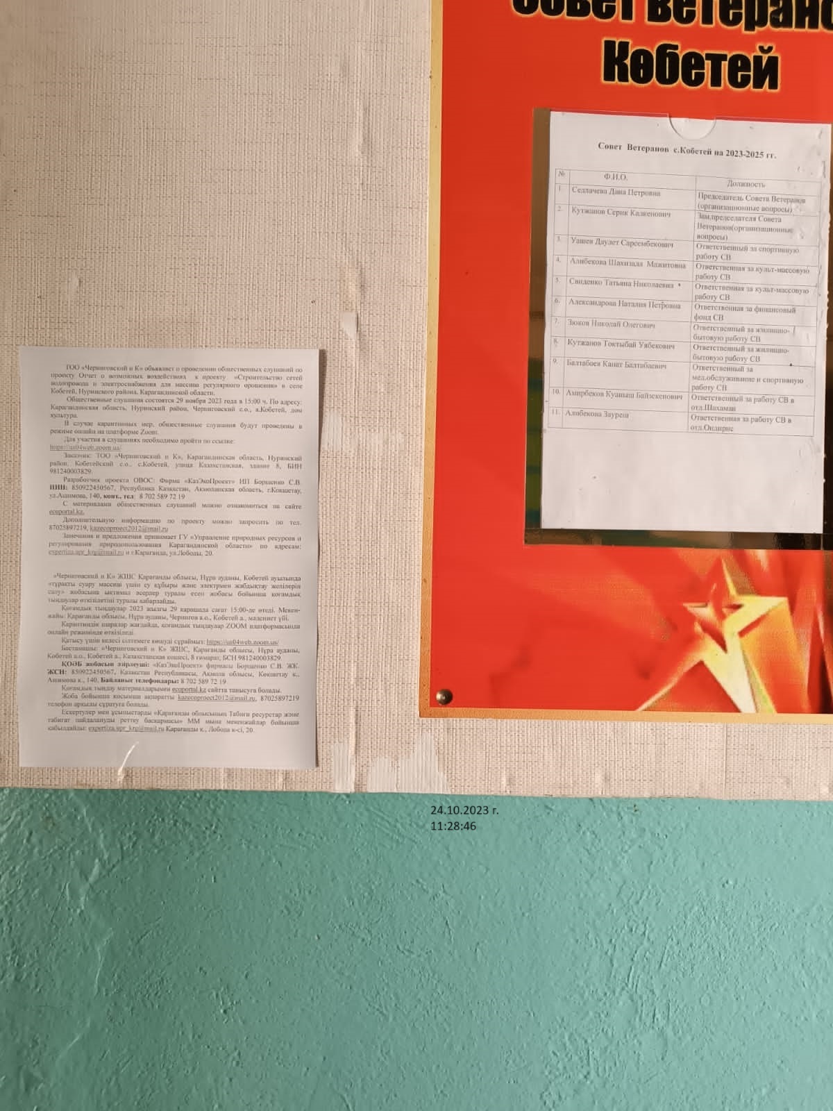 Общественные слушания состоятся 29 ноября 2023 года в 15:00 ч. По адресу: Карагандинская область, Hуринский район, Черниговский с.о., а.Кобетей, дом культура.