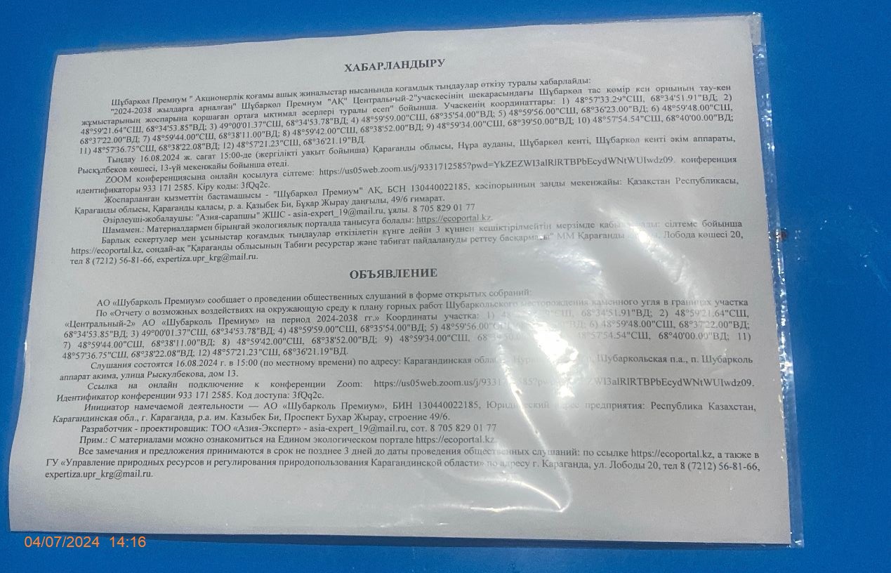 Слушания состоятся 16.08.2024 г. в 15:00 (по местному времени) по адресу: Карагандинская область, Hуринский район, Шубаркольская п.а., п. Шубарколь аппарат акима, улица Рыскулбекова, дом 13.