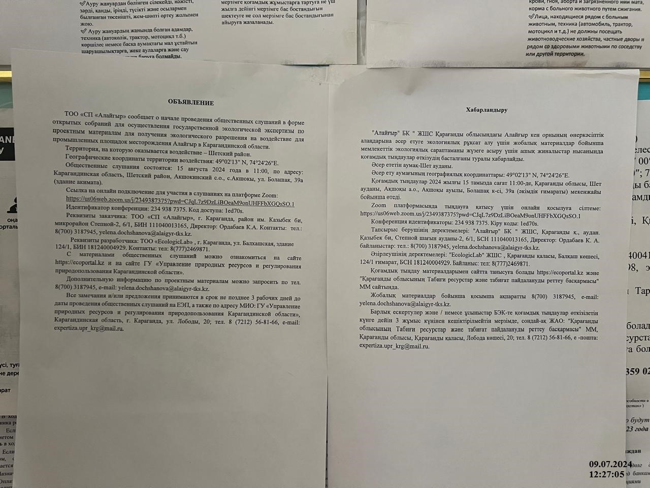 Общественные слушания состоятся: 15 августа 2024 года в 11:00, по адресу: Карагандинская область, Шетский район, Акшокинский с.о., с.Акшокы, ул. Болашак, 39а (здание акимата).