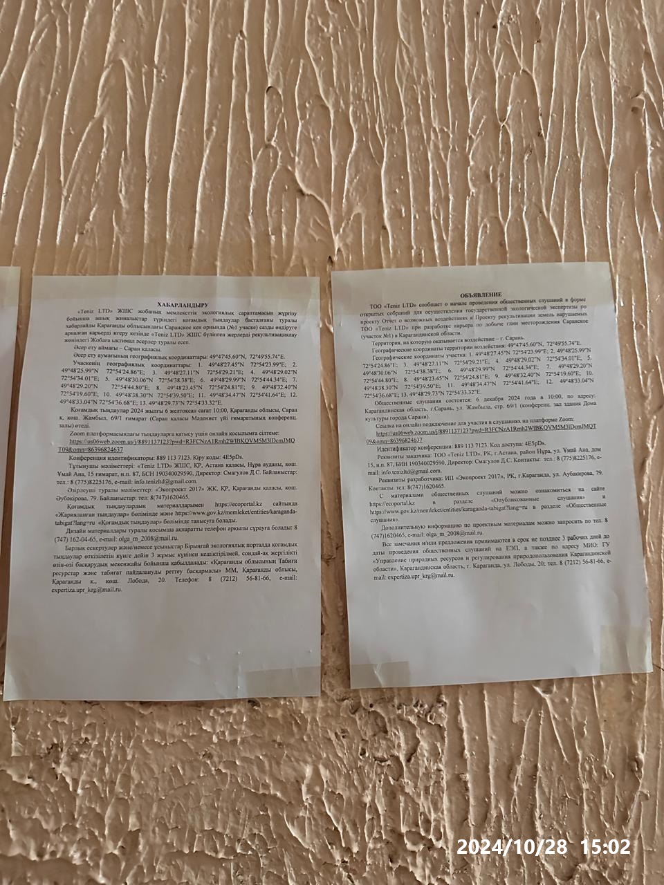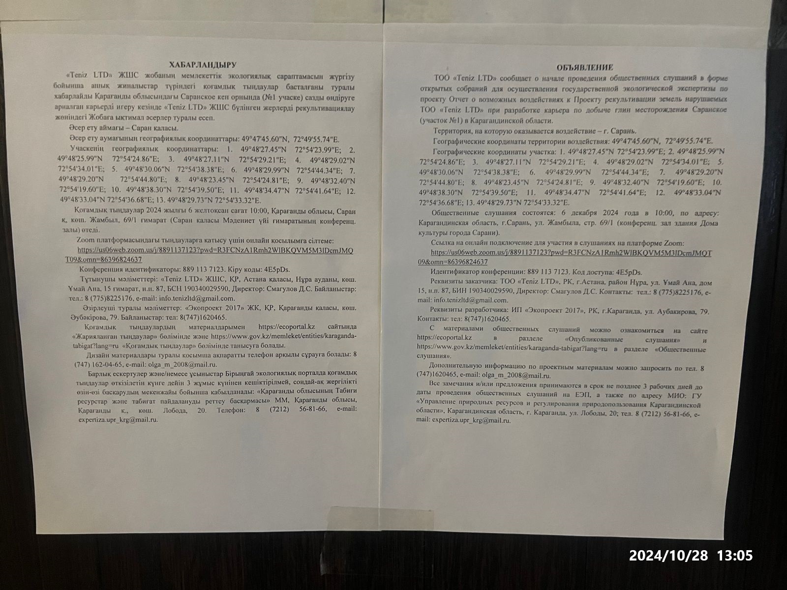 Общественные слушания состоятся: 6 декабря 2024 года в 10:00, по адресу: Карагандинская область, г.Сарань, ул. Жамбыла, стр. 69/1 (конференц. зал здания Дома культуры города Сарани).