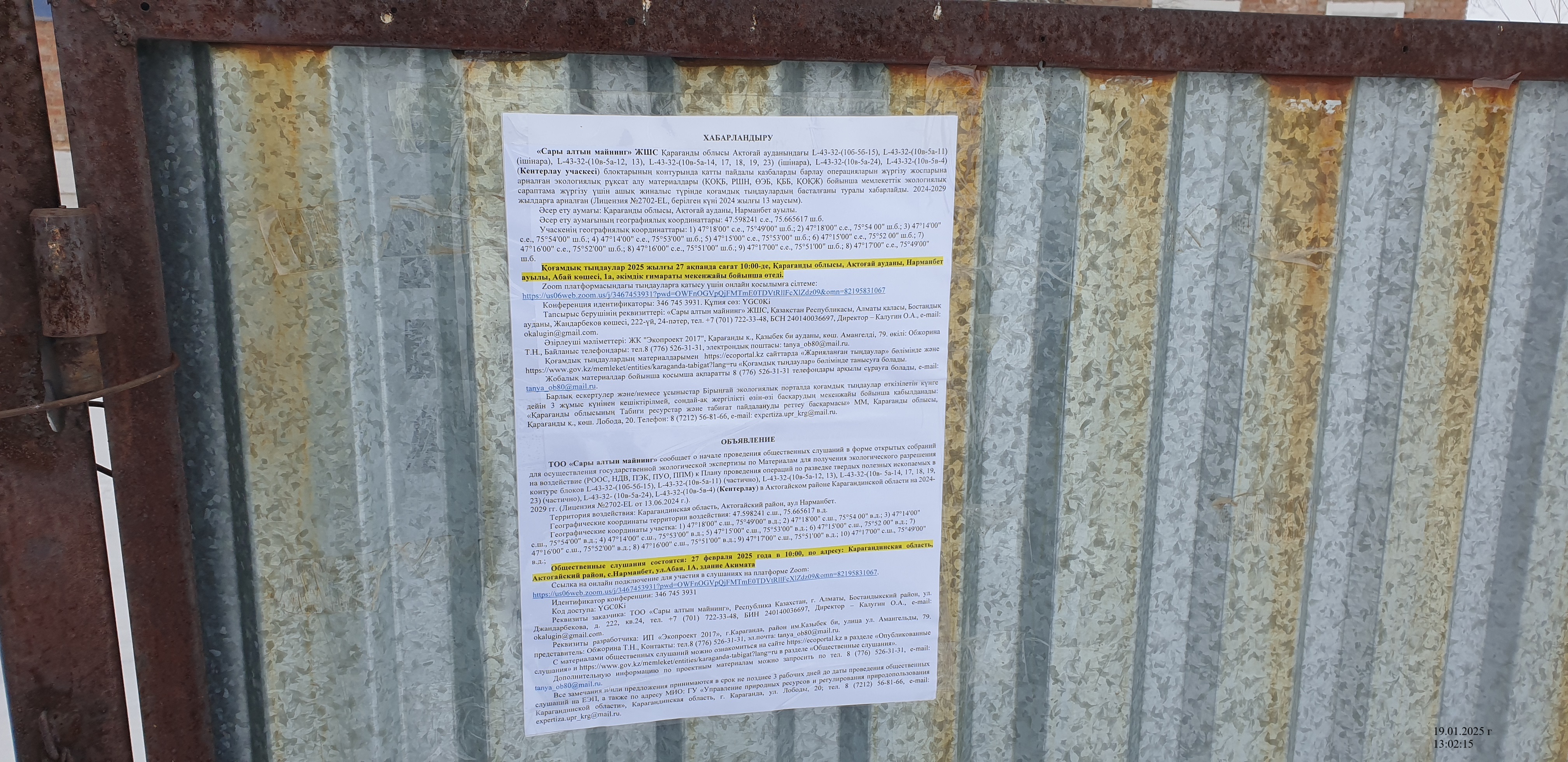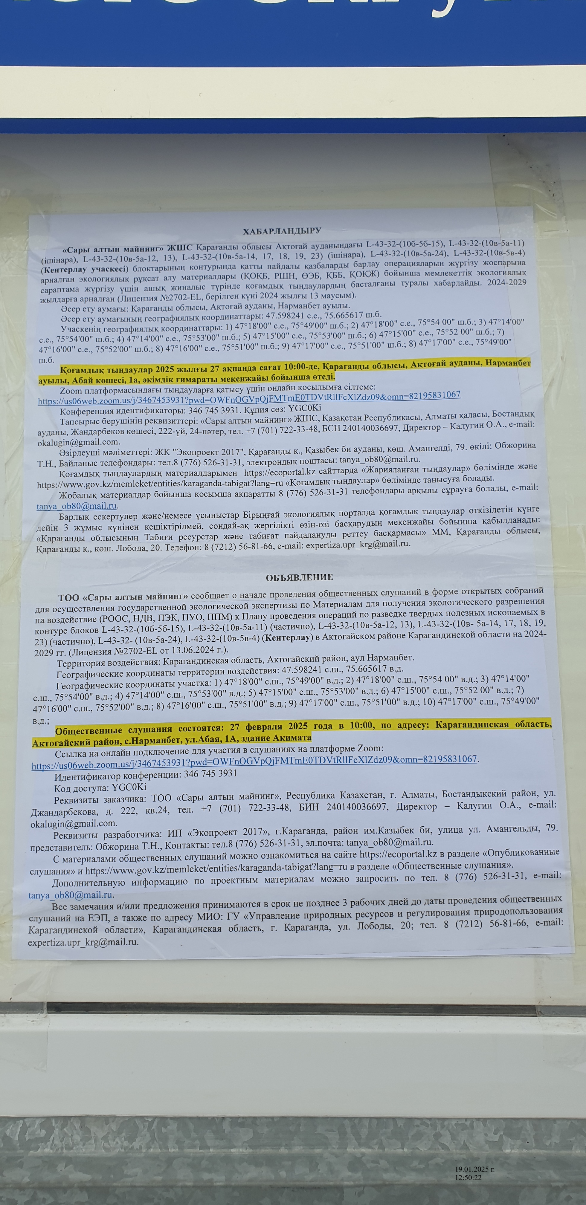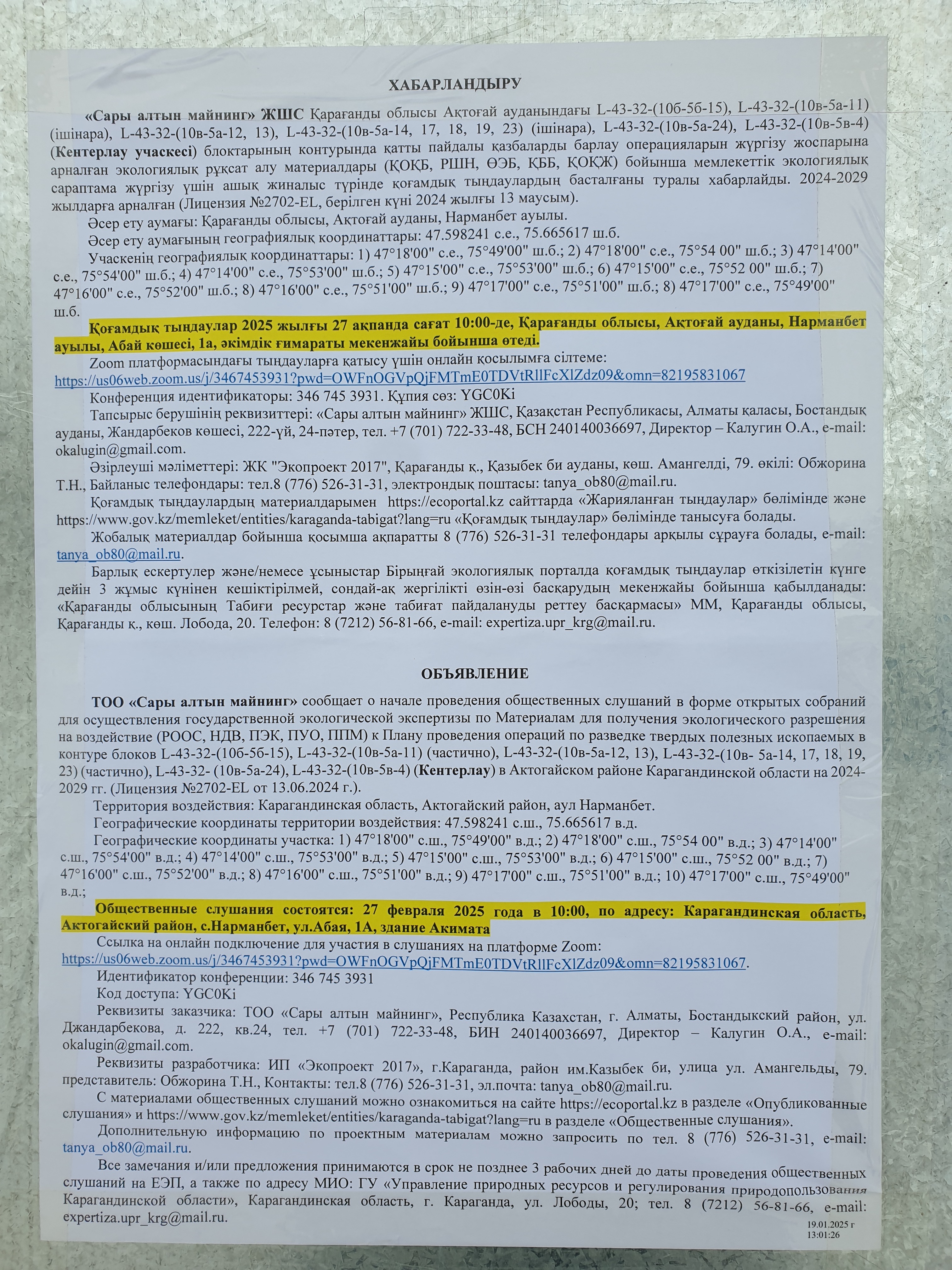 Общественные слушания состоятся: 27 февраля 2025 года в 10:00, по адресу: Карагандинская область, Актогайский район, с.Нарманбет, ул.Абая, 1А, здание Акимата