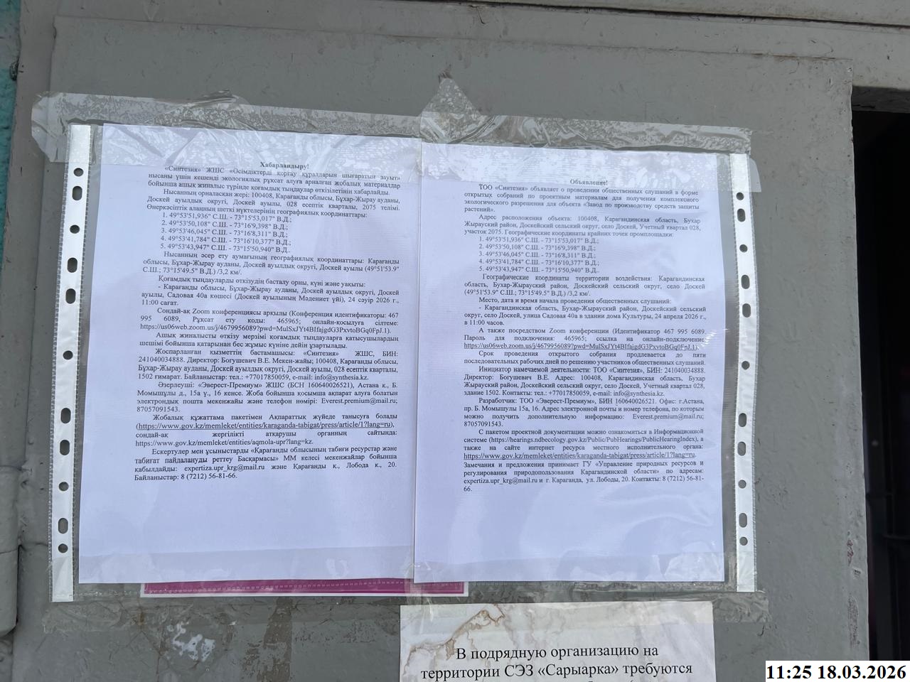С пакетом проектной документации можно ознакомиться в Информационной системе (https://hearings.ndbecology.gov.kz/Public/PubHearings/PublicHearingIndex), а также на сайте интернет ресурса местного исполнительного органа: https://www.gov.kz/memleket/entities/karaganda-tabigat/press/article/1?lang=ru. Замечания и предложения принимает ГУ «Управление природных ресурсов и регулирования природопользования Карагандинской области» по адресам: expertiza.upr_krg@mail.ru и г. Караганда, ул. Лободы, 20. Контакты: 8 (7212) 56-81-66.