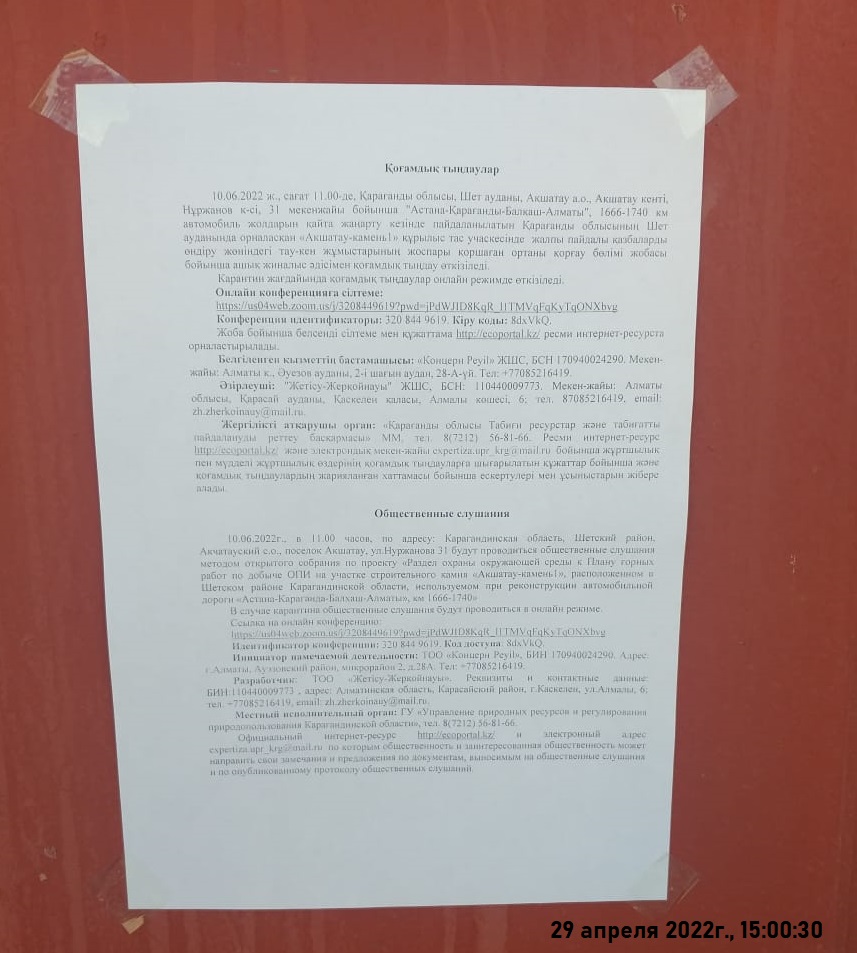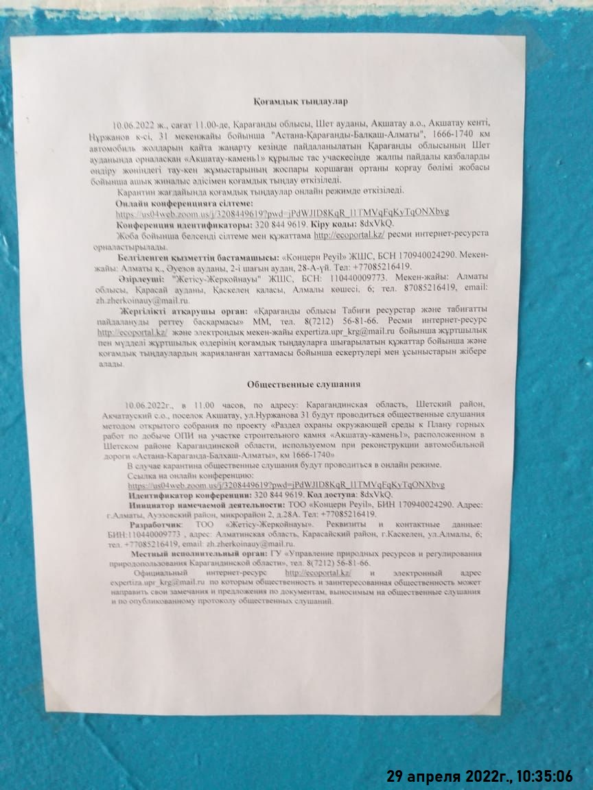 10.06.2022г., в 11.00 часов, по адресу: Карагандинская область, Шетский район, Акчатауский с.о., поселок Акшатау, ул.Нуржанова 31 будут проводиться общественные слушания методом открытого собрания по проекту «Раздел охраны окружающей среды к Плану горных работ по добыче ОПИ на участке строительного камня «Акшатау-камень1», расположенном в Шетском районе Карагандинской области, используемом при реконструкции автомобильной дороги «Астана-Караганда-Балхаш-Алматы», км 1666-1740»
