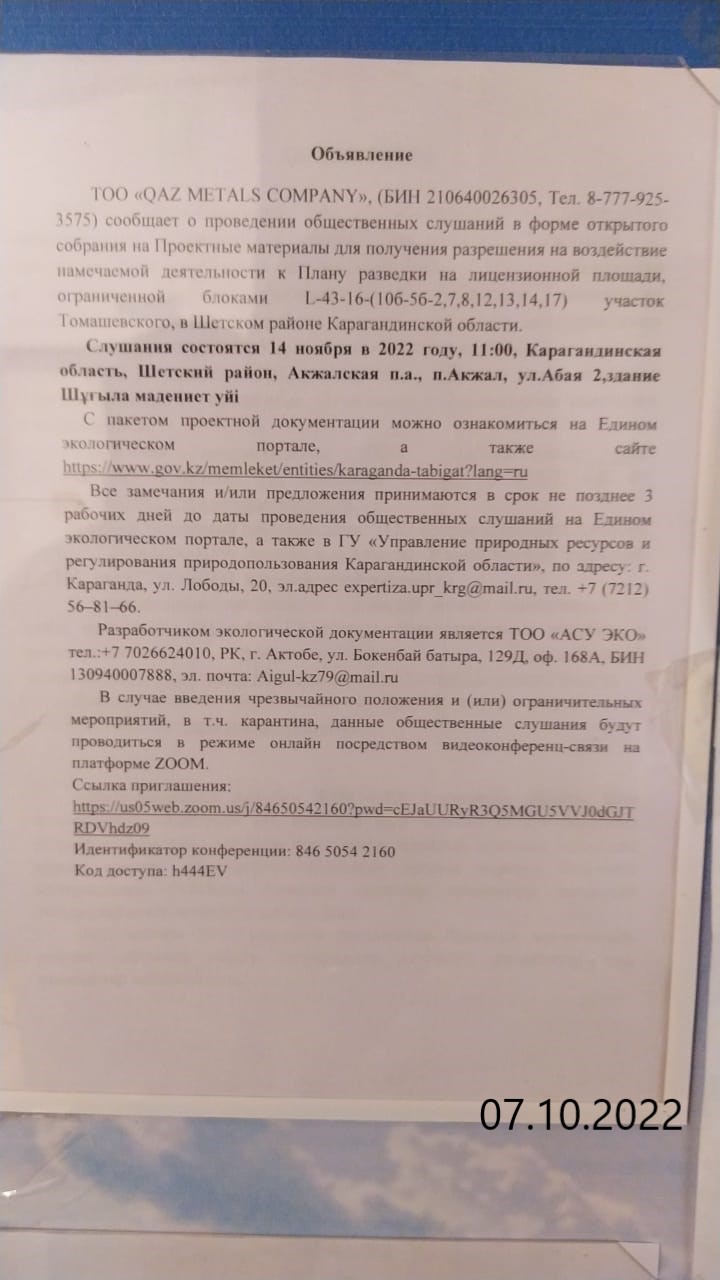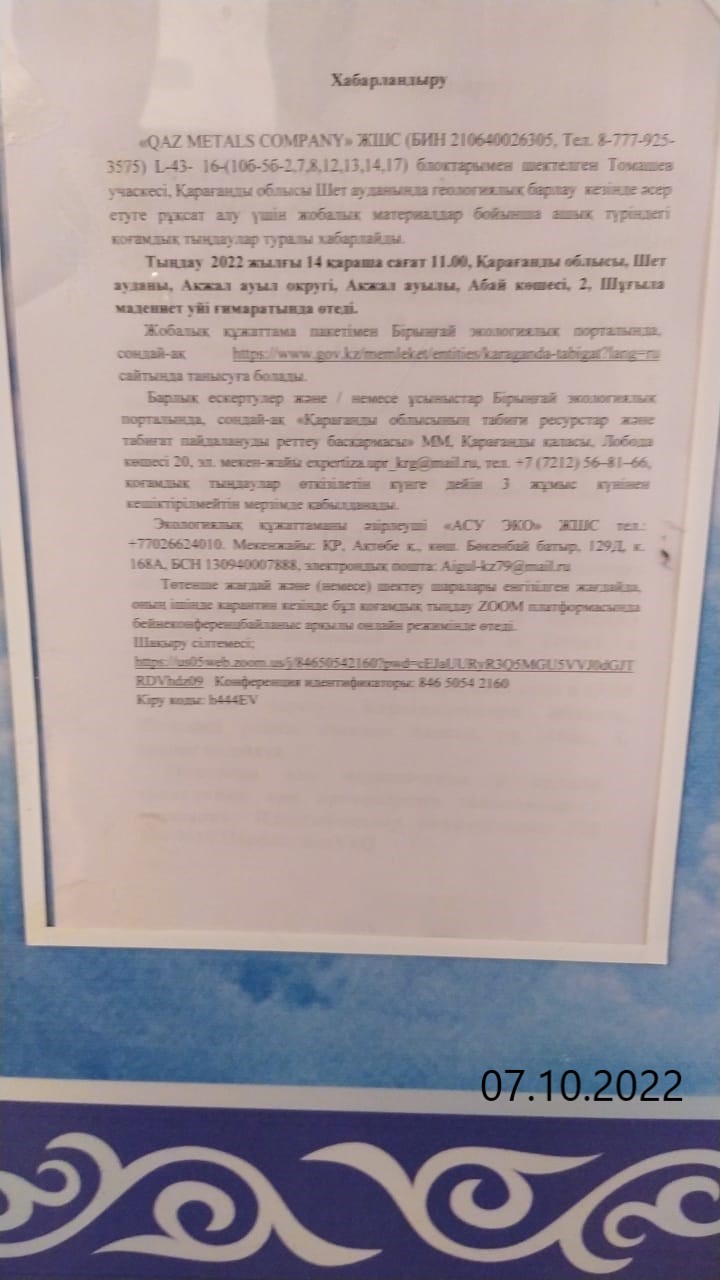 Слушания состоятся 14 ноября в 2022 году, 11:00, Карагандинская область, Шетский район, Акжалская п.а., п.Акжал, ул.Абая 2,здание Шұғыла мадениет уйі