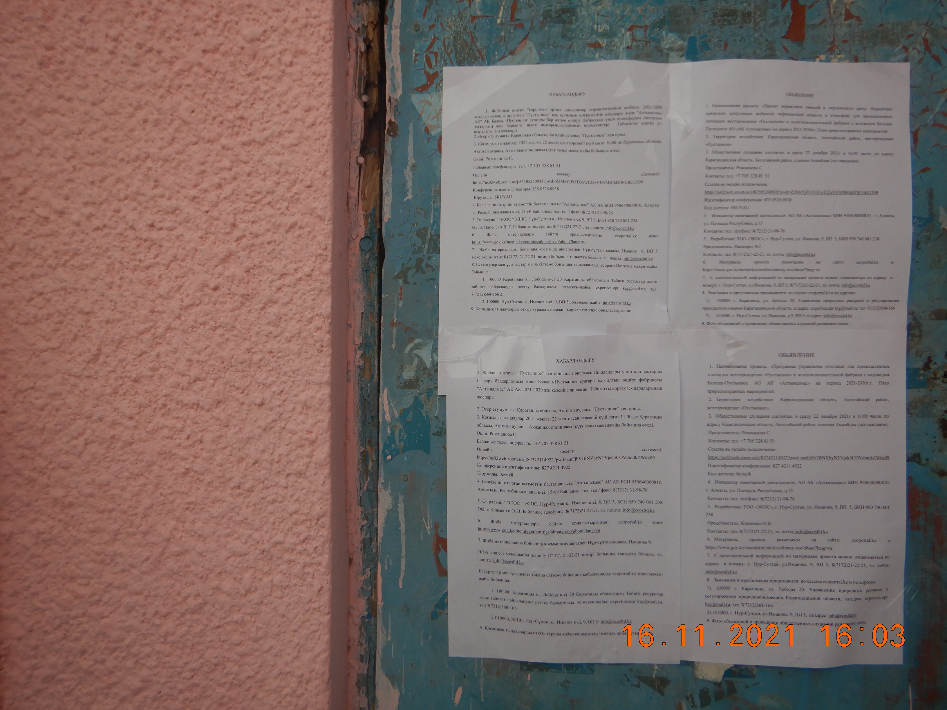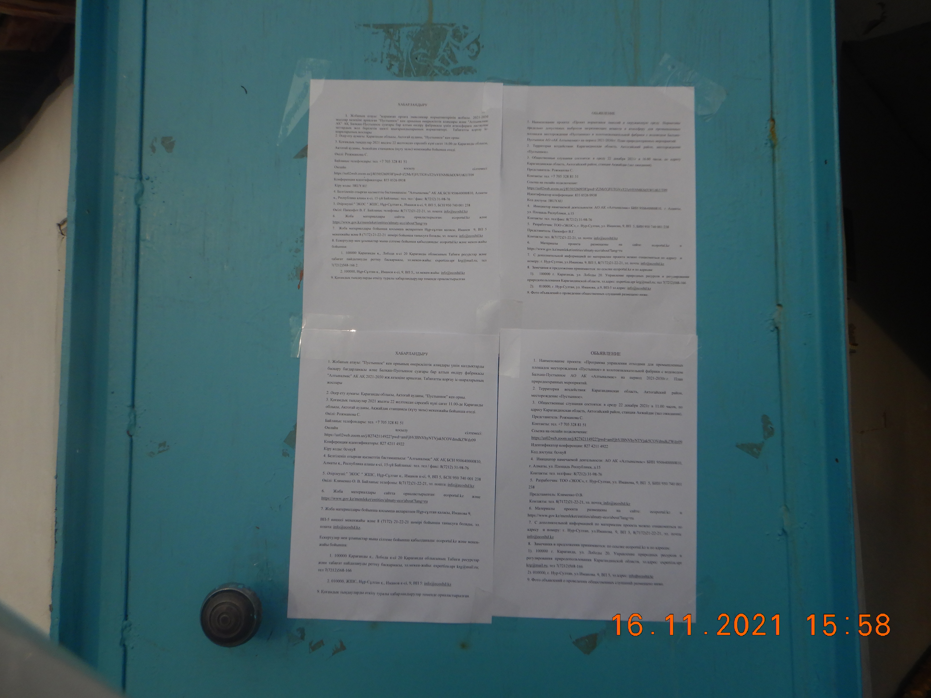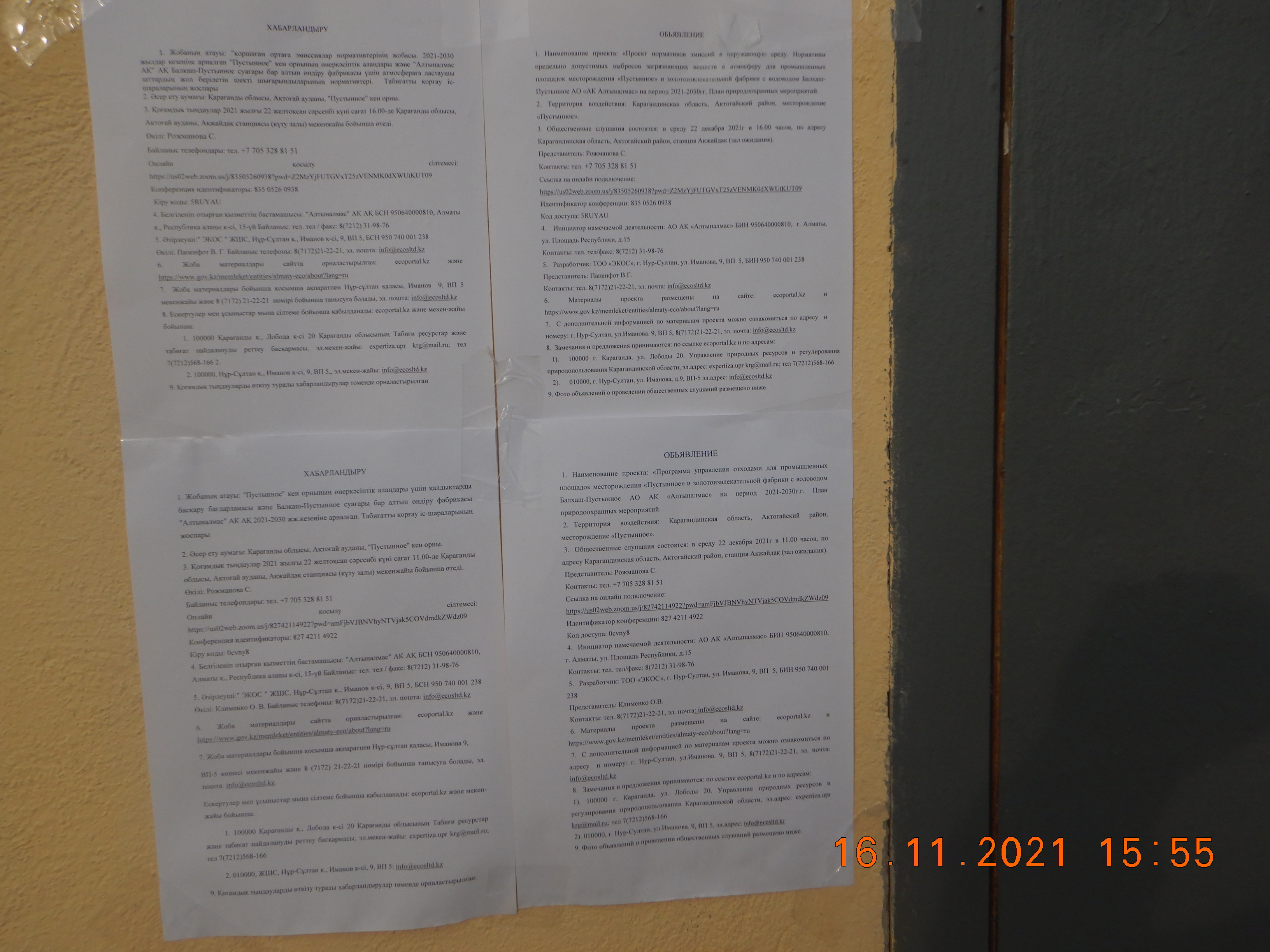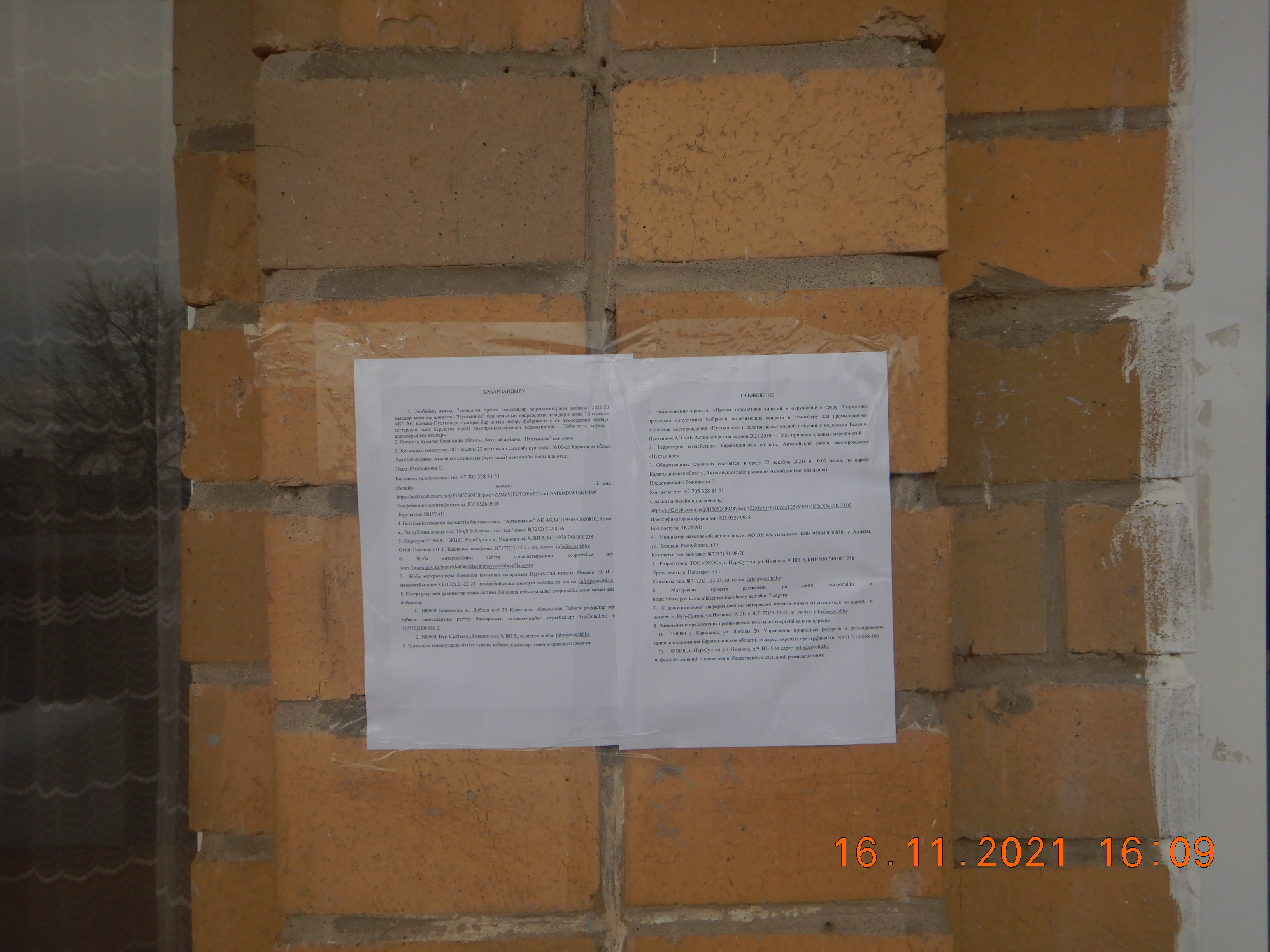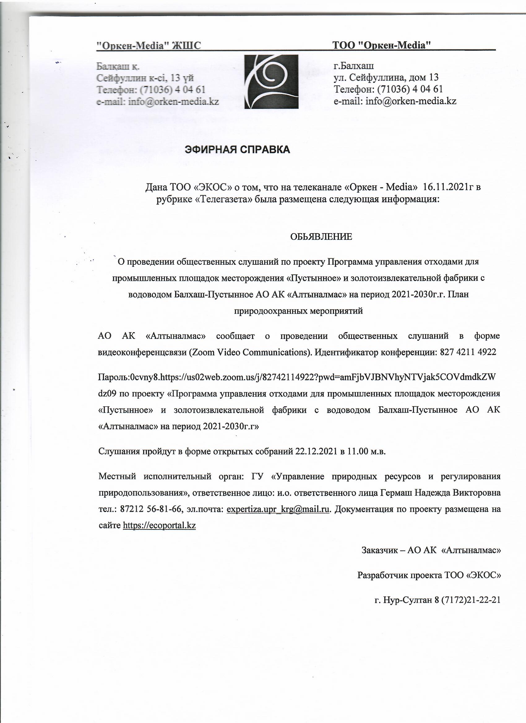3. Общественные слушания состоятся: в среду 22 декабря 2021г в 11.00 часов, по адресу Карагандинская область, Актогайский район, станция Акжайдак (зал ожидания).