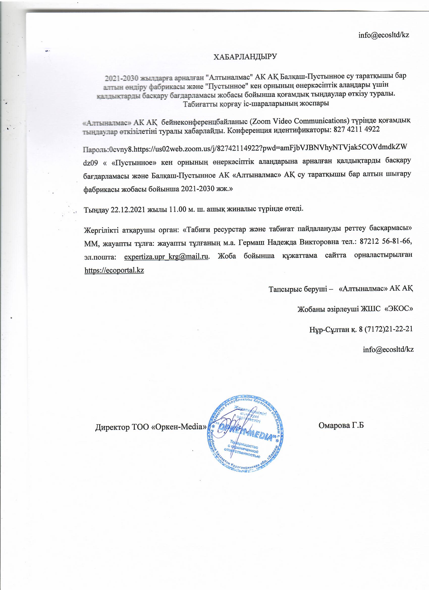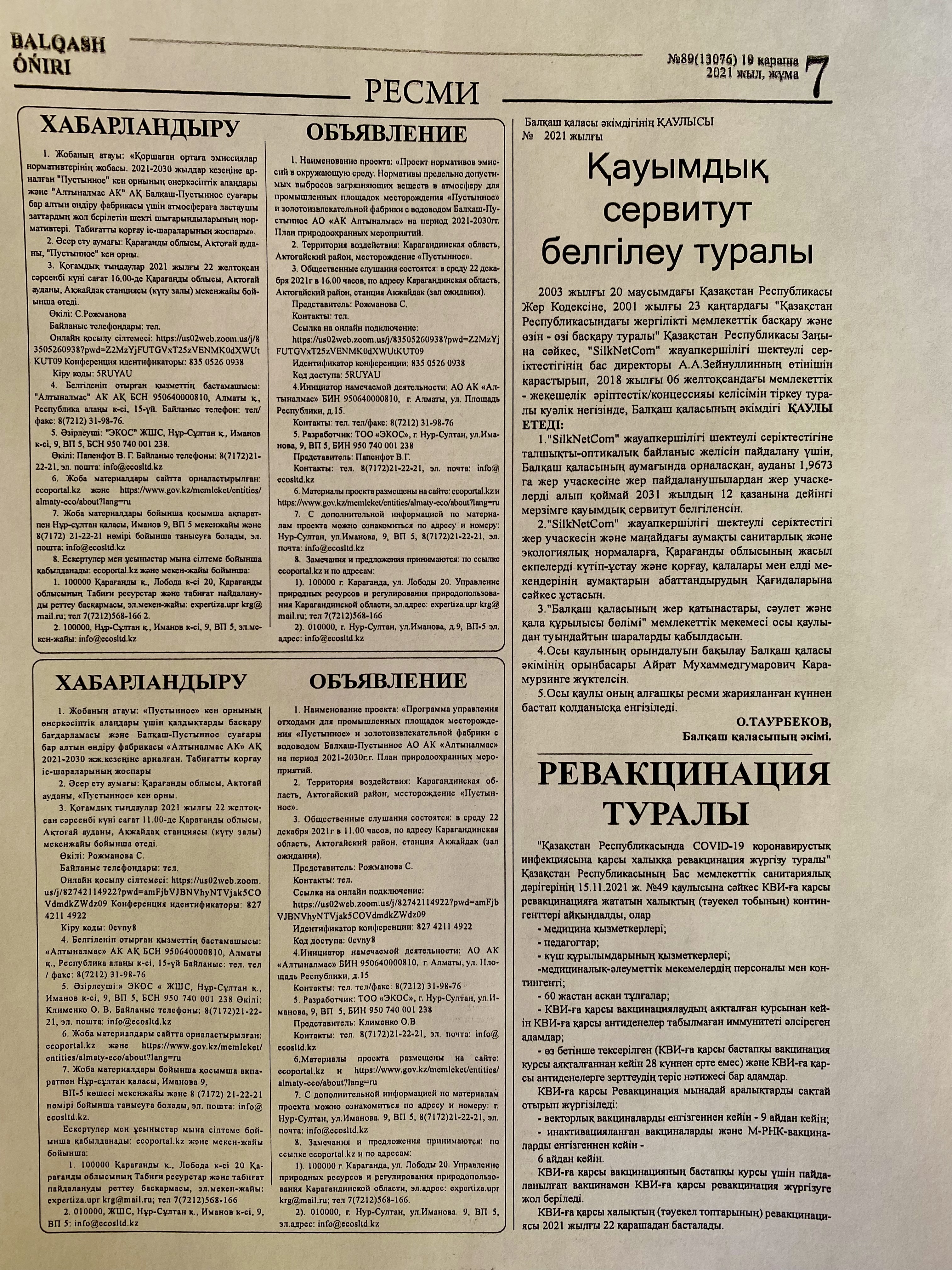 7. С дополнительной информацией по материалам проекта можно ознакомиться по адресу и номеру: г. Нур-Султан, ул.Иманова. 9, ВП 5, 8(7172)21-22-21, эл. почта: info@ecosltd.kz