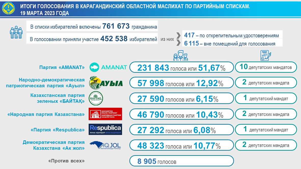 Партия «Amanat» – 231 843 или 51,67% голосов избирателей от числа принявших участие в голосовании;