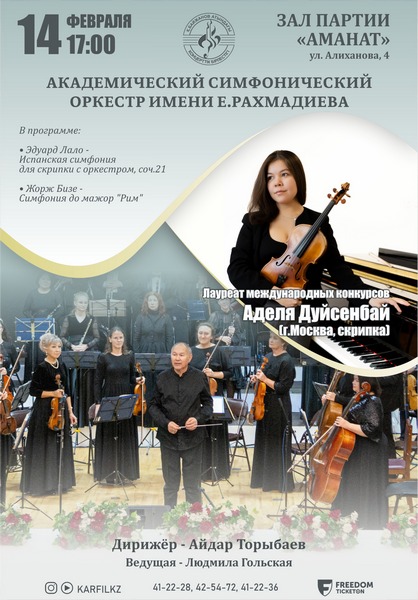 Қарағандыда классикалық музыка кеші өтеді: сахнада – жас та болса халықаралық байқауларда топ жарған скрипкашы Аделя Дүйсенбай. Ол Еркеғали Рахмадиев атындағы Қарағанды симфониялық оркестрімен бірге өнер көрсетеді. Концерт 14 ақпан күні сағат 17:00-де Amanat партиясы филиалының залында (Әлиханов көшесі, 4) өтеді.