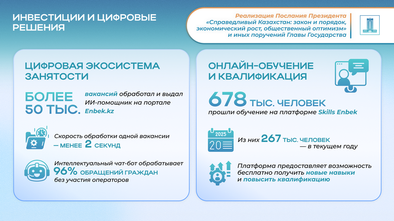 Вся работа по содействию занятости поддерживается развитой цифровой экосистемой. На платформе Enbek.kz ИИ-помощник обработал более 50 тыс. вакансий, а на платформе Skills Enbek, где искусственный интеллект помогает подобрать курсы, прошли обучение свыше 678 тыс. человек.