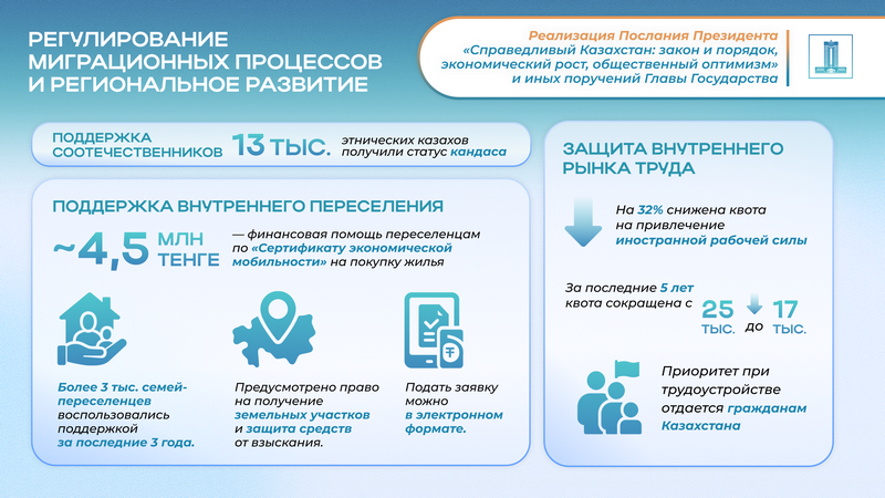 Одновременно продолжается работа по поддержке соотечественников: с момента реализации нового механизма статус кандаса получили 13 тыс. этнических казахов.