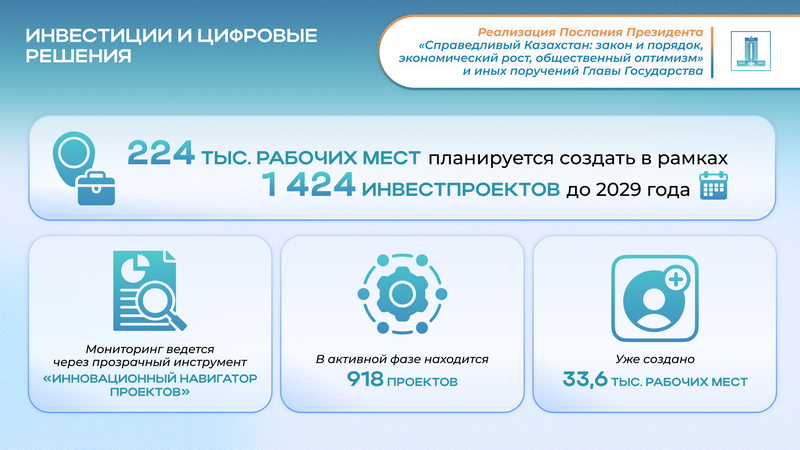 Для мониторинга создания рабочих мест действует «Инновационный навигатор проектов». В системе отслеживается 1 424 инвестпроекта с планом по созданию более 224 тыс. рабочих мест. На сегодня в активной фазе находится 918 проектов, где уже создано 33,6 тыс. рабочих мест.