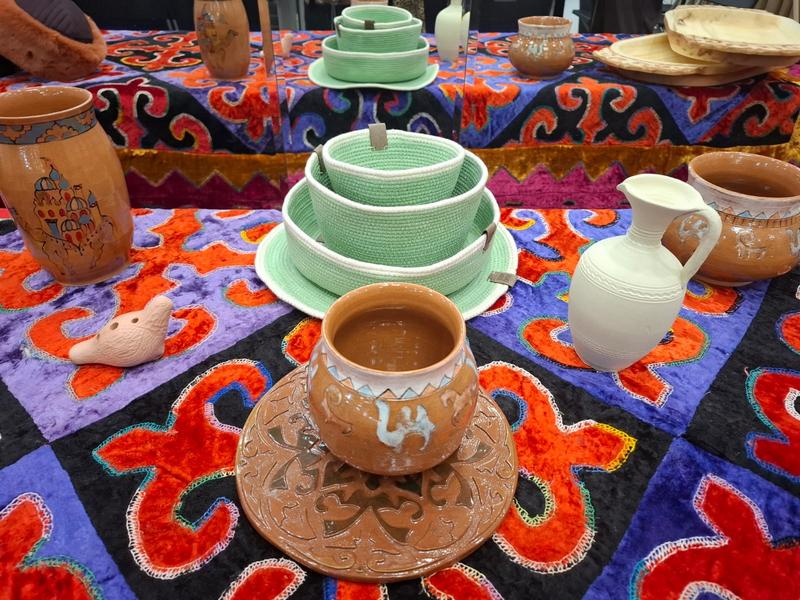 Уже у входа гостей встречала этнокультурная площадка: выставка войлочных изделий и мастер-класс по созданию текемета.