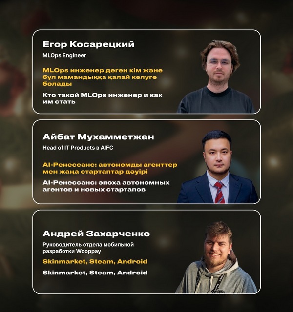 - Айбат Мұхамметжан, AIFC IT-өнімдер бөлімінің жетекшісі — «AI-Ренессанс: автономды агенттер дәуірі және жаңа стартаптар» атты дәріспен сөз сөйлейді;