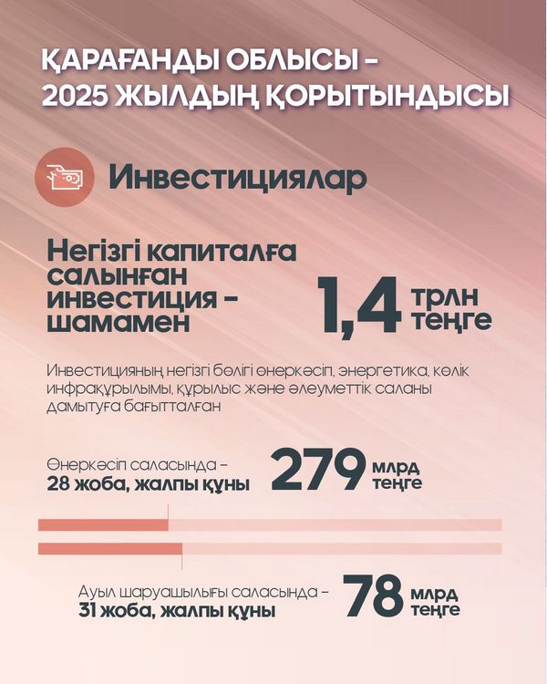 Өңірде инвестициялық белсенділік жоғары деңгейде сақталуда. 2025 жылы негізгі капиталға шамамен 1,4 трлн теңге инвестиция салынды. Қаржының басым бөлігі өнеркәсіп, энергетика, көлік инфрақұрылымы, құрылыс және әлеуметтік саланы дамытуға бағытталды. Жыл ішінде өнеркәсіп саласында жалпы құны 279 млрд теңгеден асатын 28 инвестициялық жоба іске қосылды.