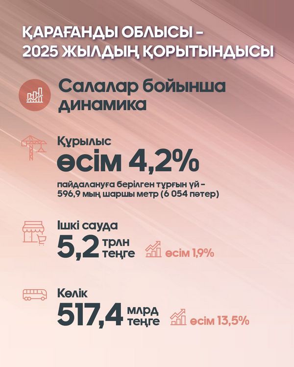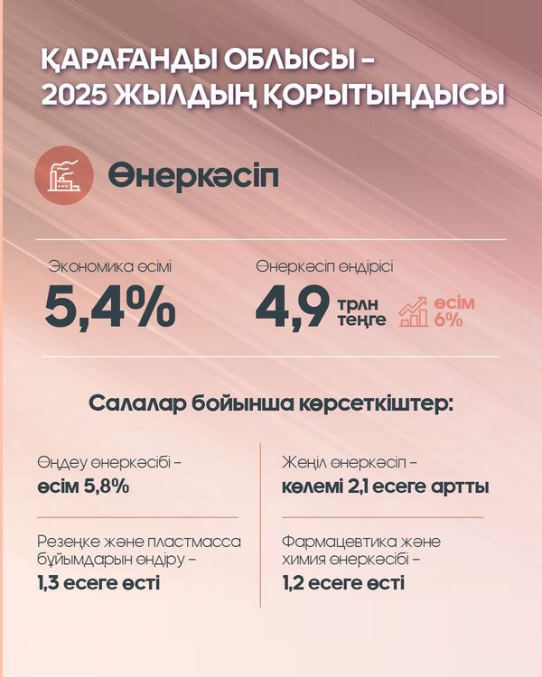 Қарағанды облысы әлеуметтік-экономикалық дамудың тұрақты қарқынын сақтап отыр. 2025 жылдың қорытындысы бойынша өңірде негізгі барлық макроэкономикалық көрсеткіштер бойынша оң динамика қалыптасты. Облыс экономикасының өсімі 5,4%-ды құрады. Өнеркәсіп өндірісінің көлемі 6%-ға ұлғайып, 4,9 трлн теңгеге жетті. Оның ішінде өңдеу өнеркәсібі жетекші рөл атқарып, бұл секторда өндірілген өнім көлемі 3,8 трлн теңгені құрады. Аталған көрсеткіштер экономиканы әртараптандыру және жоғары қосылған құны бар өнім өндіру бағытының жүйелі түрде жүзеге асып жатқанын көрсетеді.