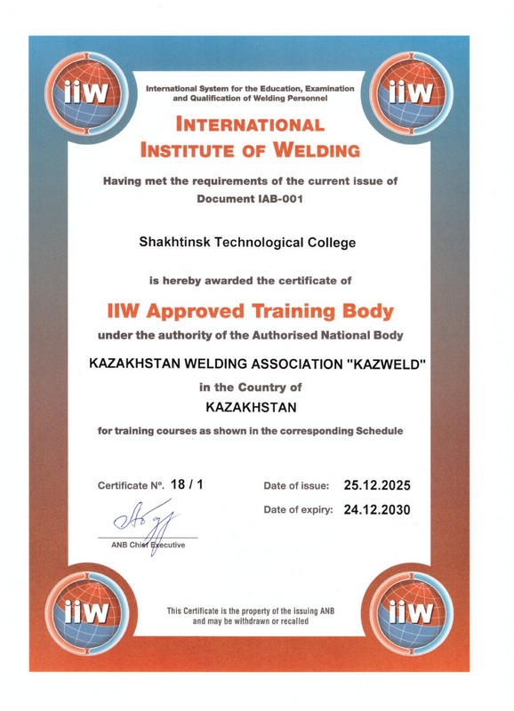 Шахтинск технологиялық колледжі «дәнекерлеу ісі» мамандығы бойынша халықаралық салалық аккредиттеуден өтті. Оқу орны дәнекерлеушілерді халықаралық стандарттарға сәйкес дайындайды.