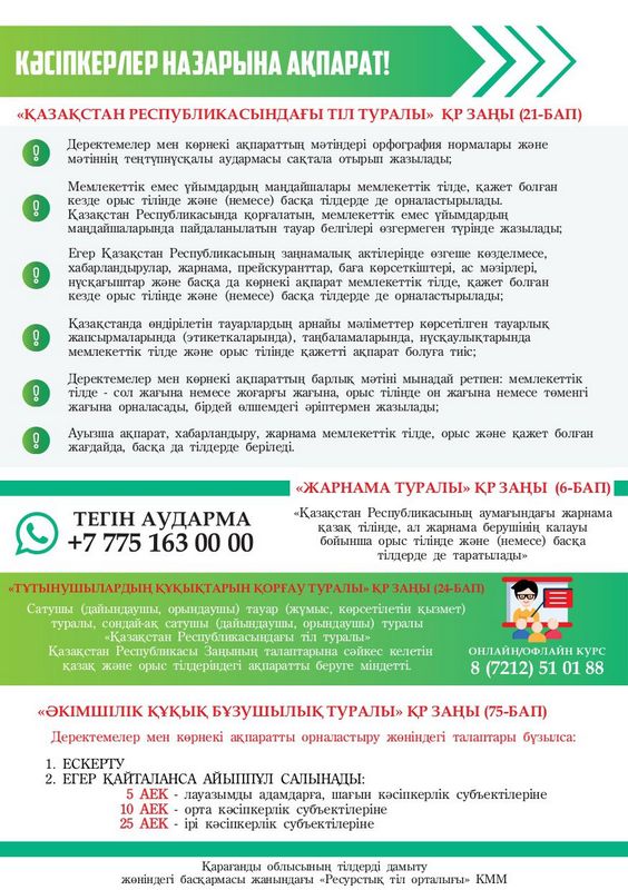 Қарағанды облысының кәсіпкерлері жарнама мәтіндері мен маңдайшаларды қазақ тілінде талапқа сай рәсімдеу бойынша тегін кеңес ала алады. Тілдерді дамыту басқармасына қарасты Ресурстық тіл орталығында тілдік мәселелер жөніндегі жедел желі жұмыс істейді.