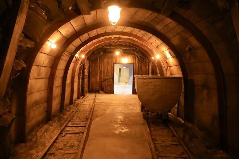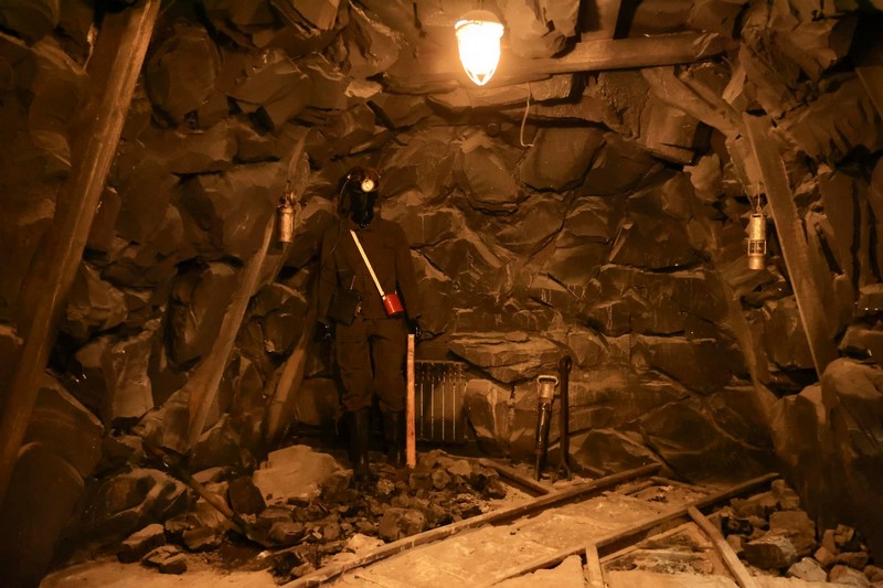 Жартылай қараңғы залда 1940-жылдардағы шахта көрінісі қайта жасақталған: тар өткел, вагонетка, шахтёр құралдары мен арнайы киімдер жерасты еңбегінің атмосферасын айқын жеткізеді.